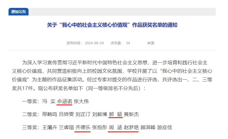 9月29日,学校公布了“我心中的社会主义核心价值观”作品征集活动获奖名单,williamhill威廉希尔学生佘涵诺获得一等奖;williamhill威廉希尔教师郭颖获得二等奖;williamhill威廉希尔学生齐德乐、周涵、赵梦艳获得三等奖。