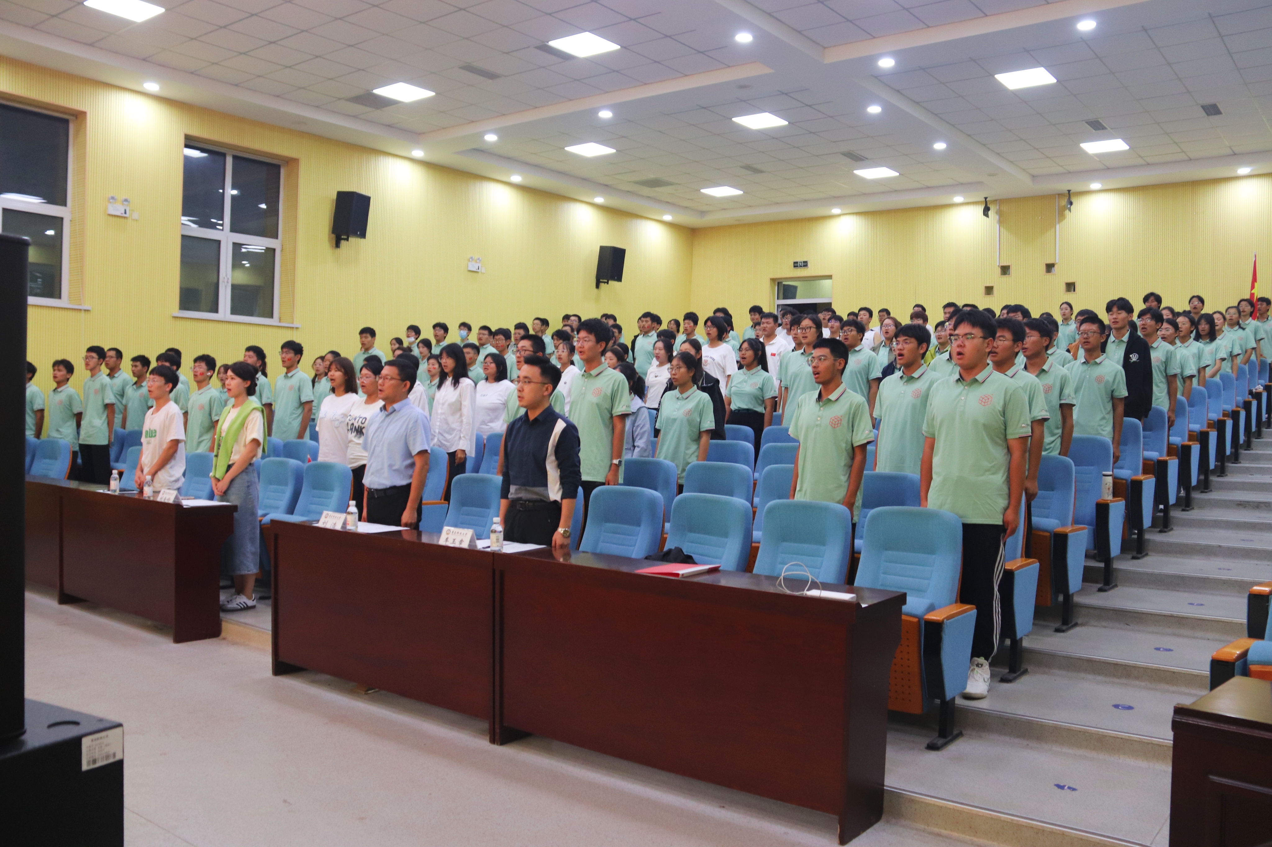 比赛开始前,全体师生共唱国歌。激昂的旋律与有力的歌声在礼堂内激荡,表达了全体师生浓厚的爱国情怀。随后,各班先后进行校歌与自选歌曲合唱展示。