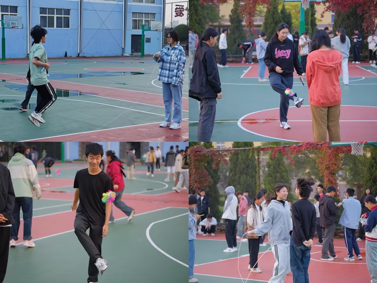 在跳绳比赛中,五颜六色的绳子在同学们手中挥舞生风、花样多变,一个个腾空跳跃的身影,在小绳两边来回飞舞,小绳亦有节奏地上下摆动,化作了一条条美丽的彩虹,给跃动的校园平添了一道亮丽的风景线。这既展现了个人的身体协调性和节奏感,又体现了团队成员之间的默契配合。随着时间的推移,活动圆满结束。同学们的热情参与不仅展示了他们朝气蓬勃的面貌,也体现了他们的团队协作精神和坚韧不拔的毅力。