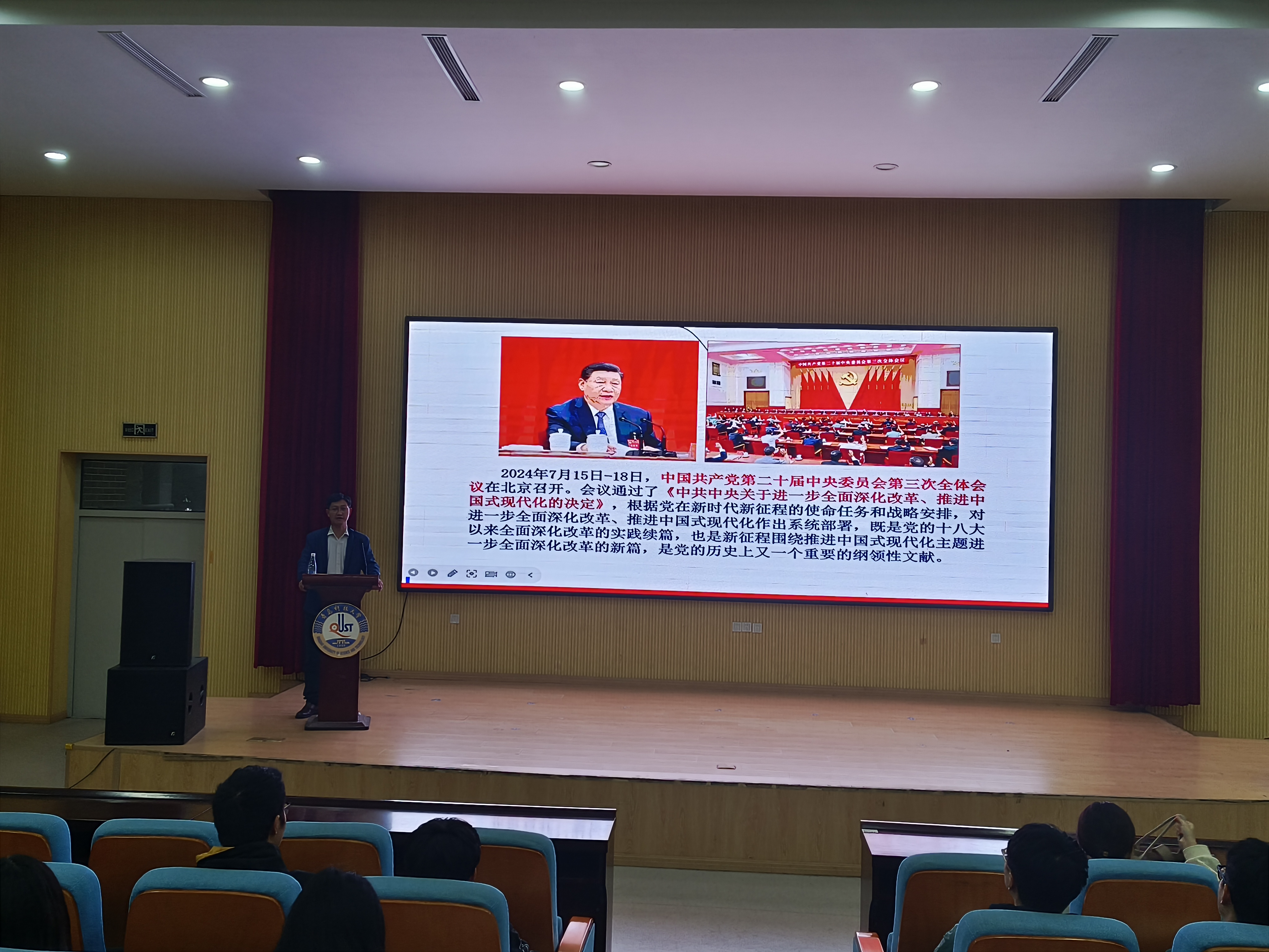 周宪锋向全体学生传达了党的二十届三中全会的核心精神和重要决策,深入剖析了《中共中央关于进一步全面深化改革、推进中国式现代化的决定》的重大意义和深远影响。在授课过程中,周宪锋紧密结合学校、学院实际,阐述了全会精神对学院工作的具体指导作用。他鼓励大家要准确把握时代脉搏,将全会精神转化为推动个人成长与学院发展的强大动力。