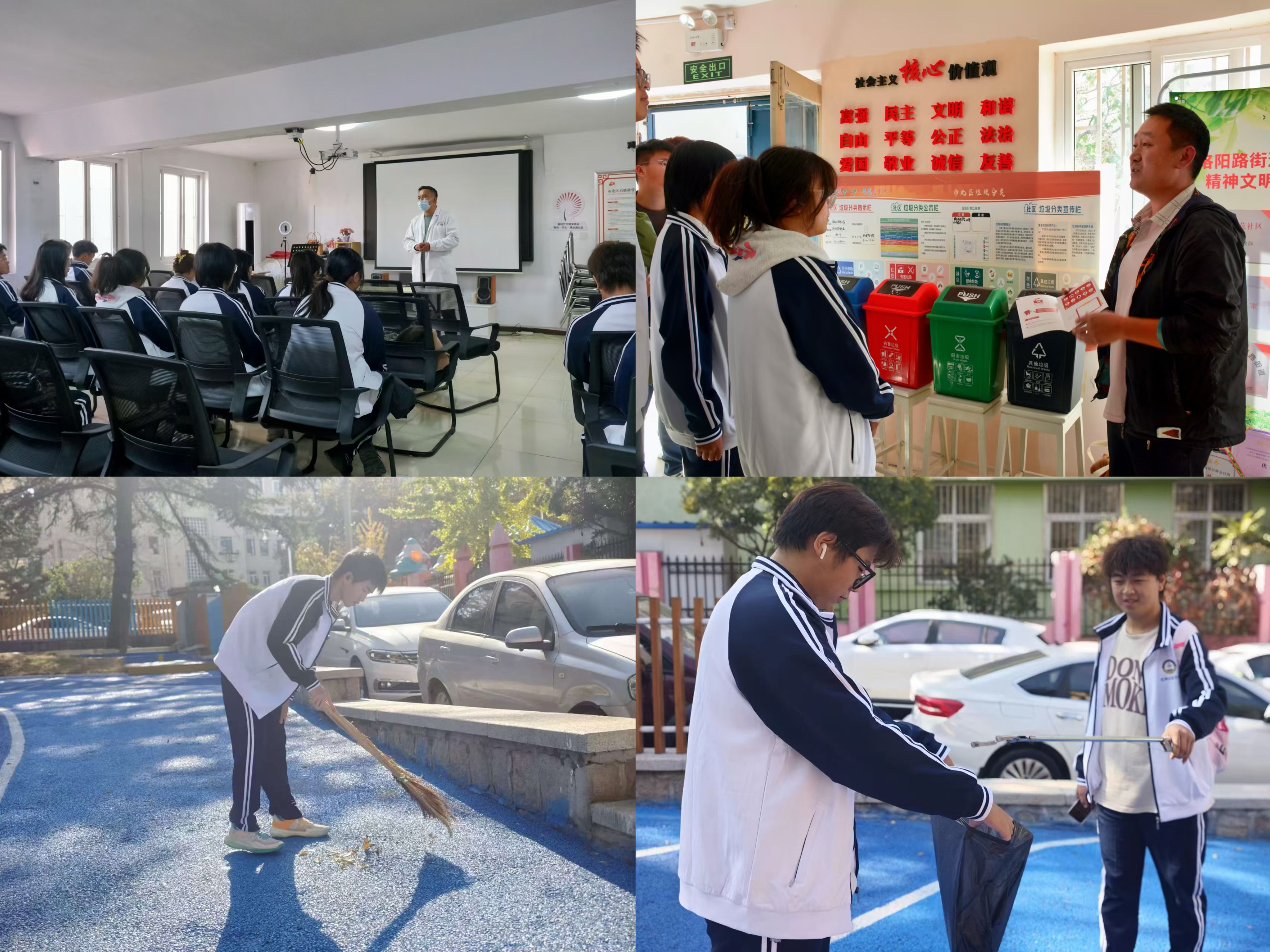 活动开始,商丘路社区的医生针对预防疾病问题,向同学们展开了知识宣讲。同学们受益匪浅,纷纷表示会在日常生活中培养良好的习惯,让自己和周围人的身体健康得到保障。社区工作人员为大家科普环保知识,包括垃圾分类知识讲解、垃圾处理现状的介绍等。期望同学们能够树立起“垃圾分类,从我做起”观念,为建设美丽、舒适的社会环境贡献自己的力量。