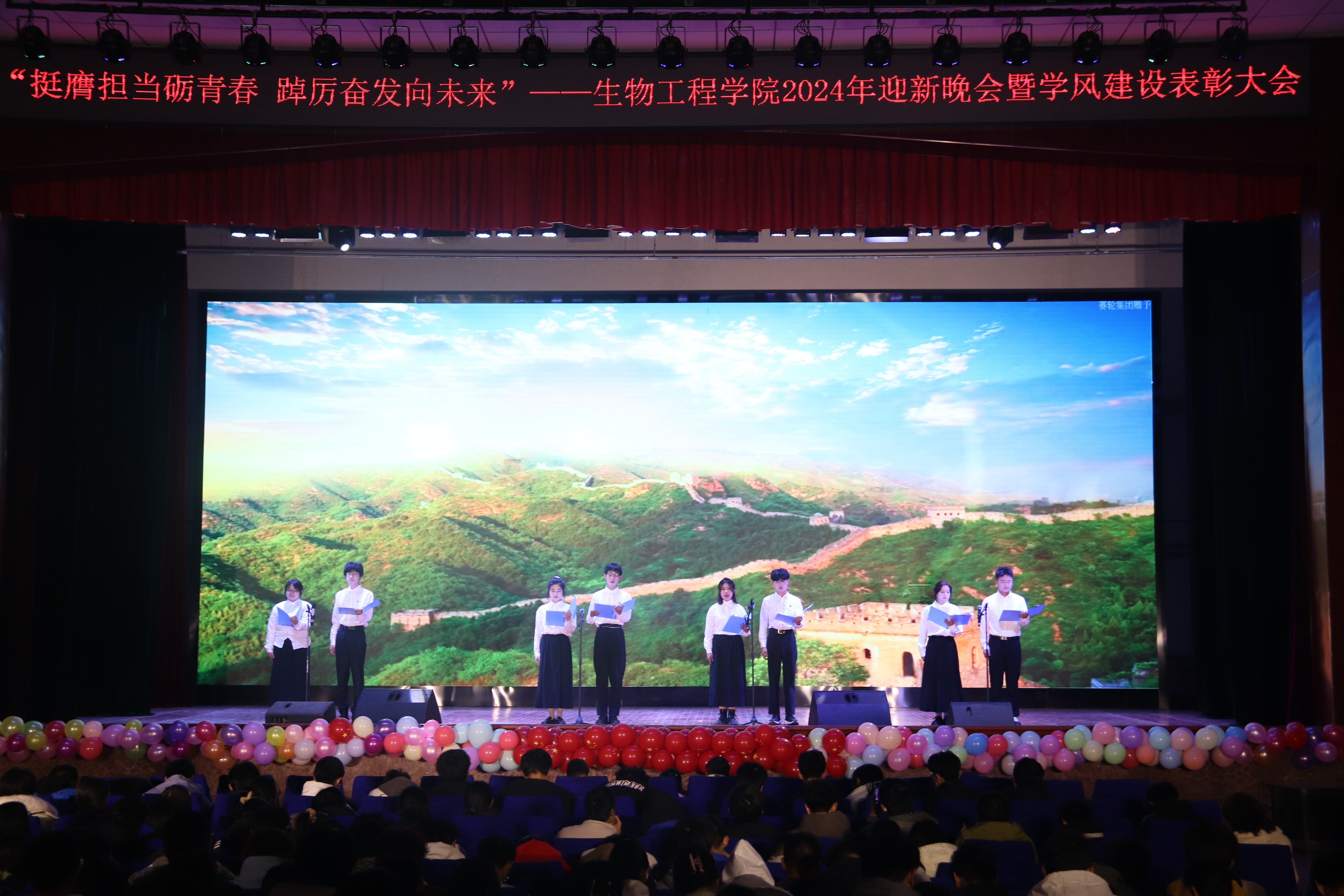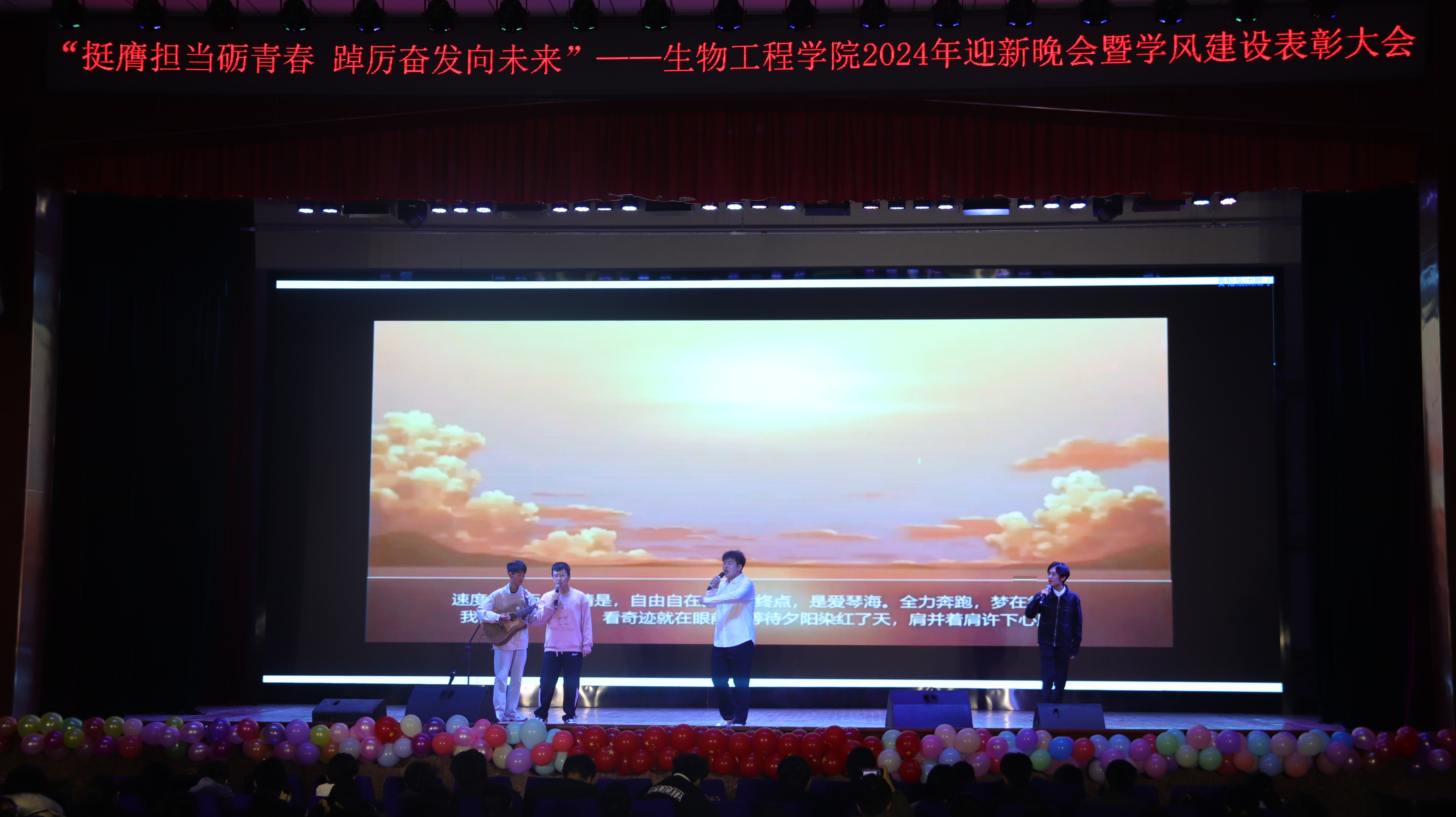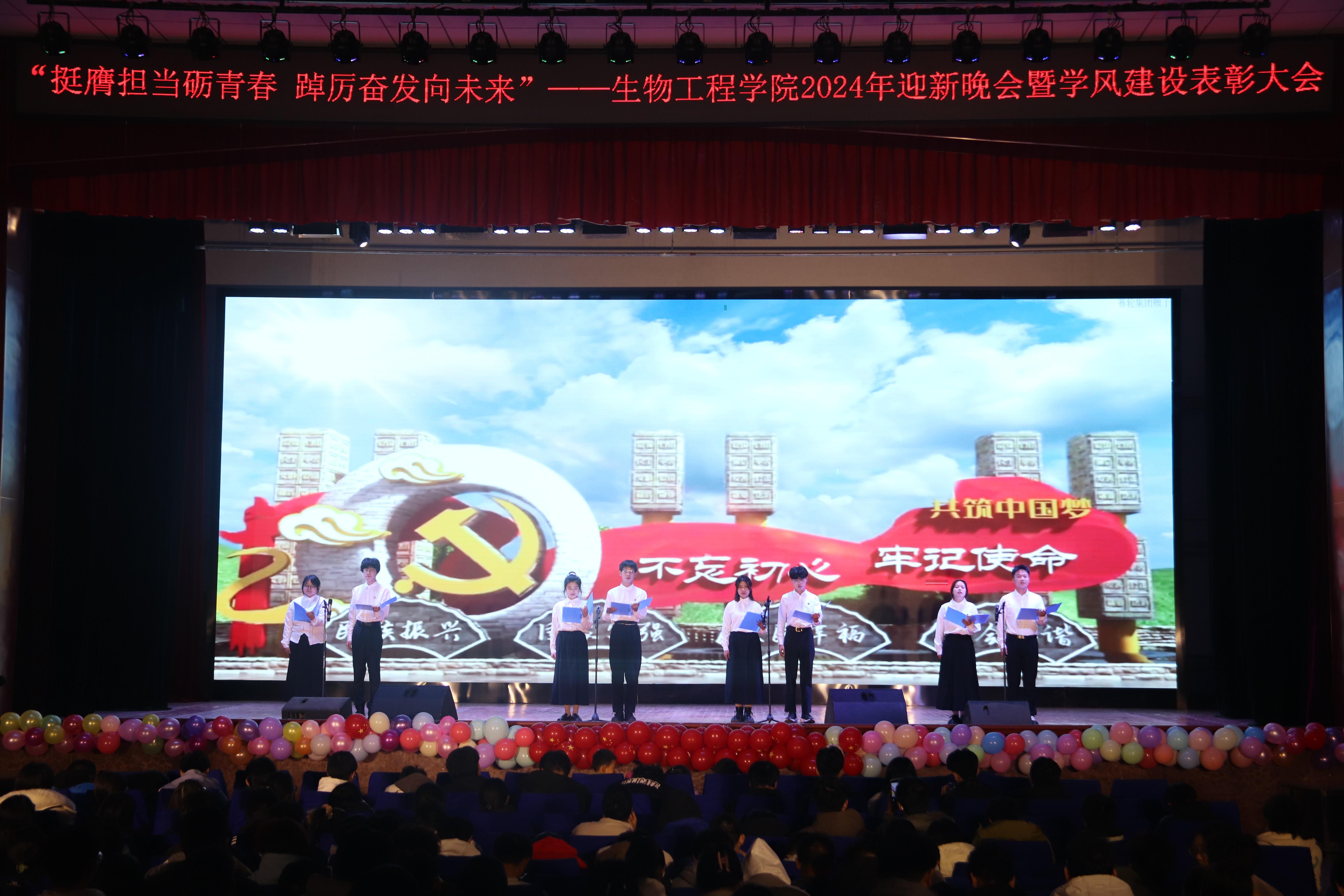 本次晚会以“挺膺担当砺青春,踔厉奋发向未来”为主题,分为《赓续笃行扬“新”帆》《激扬青春展“新”颜》《挺膺担当绘“新”篇》三个篇章。彰显了生物学子在新时代新征程中,以坚定的信念和不懈的努力,扬起青春航帆,展现青春面貌,用实际行动和担当精神书写为中国现代化挺膺担当的青春篇章。