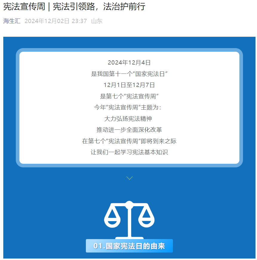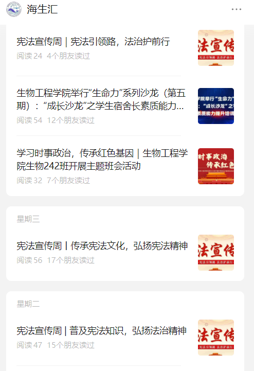 “海生汇”开设专题系列文章,围绕宪法的相关内容,制定系列化、主题化的文章,普及宪法基本知识,介绍宪法的定义、作用和历史背景,引导学生尊崇宪法、学习宪法、维护宪法,在全院营造关注宪法、学习宪法的良好氛围。