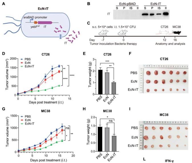 研究团队构建了一种PD-L1 靶向免疫毒素 αPD-L1-PE38,通过将抗 PD-L1 纳米抗体与临床验证的 PE38 毒素融合,使其在对肿瘤细胞展现出强大的抗肿瘤活性。为了将这种免疫毒素精准递送至肿瘤组织,顾玉超教授团队巧妙地利用了E. coli Nissle 1917(EcN)靶向肿瘤组织的特性。团队通过基因工程改造EcN 菌株,通过静脉注射或瘤内注射,EcN 能够定植于实体瘤中并在肿瘤组织中释放αPD-L1-PE38 免疫毒素。实验结果显示,工程菌株在细胞和动物水平均展现出显著的抗肿瘤活性。此外,研究团队还对免疫毒素的亲和力进行了优化,优化后的免疫毒素进一步增强了对PD-L1 的结合能力和抗肿瘤活性。