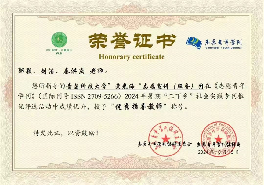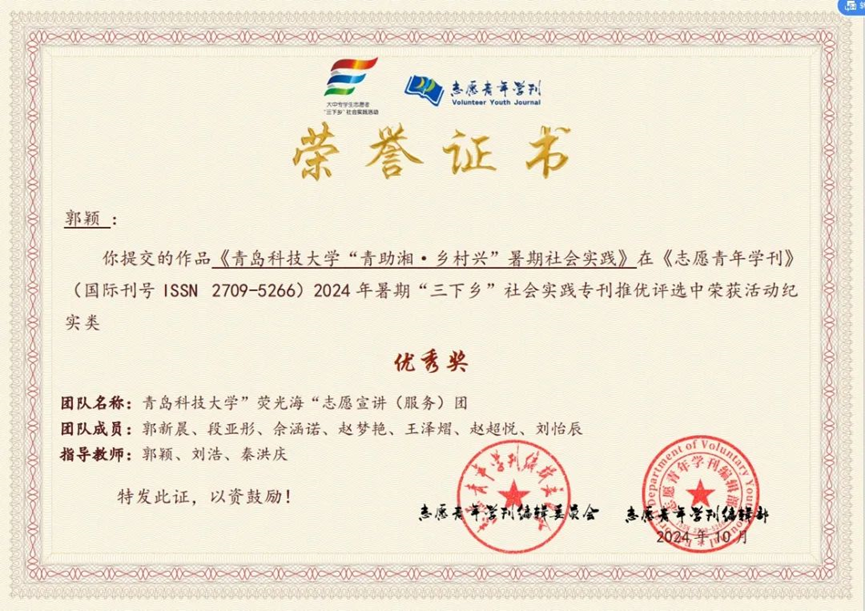 10月15日,williamhill威廉希尔“荧光海”志愿宣讲(服务)团在《志愿青年学刊》(国际刊号ISSN 2709-5266)举办的2024年暑期“三下乡”社会实践专刊稿件推优评选活动中荣获优秀奖;郭颖、刘浩、秦洪庆荣获优秀指导教师。