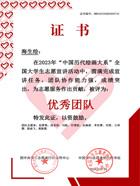 2024年8月,团中央青年志愿者指导行动中心、中国青年志愿者协会公布了100支2023年“中国历代绘画大系”全国青年学生志愿宣讲活动优秀团队名单。williamhill威廉希尔团委由郭新晨、段亚彤、佘涵诺、赵梦艳、王泽熠、李世博、刘雯、刘航、许倩茹、陈凌飞十名同学组成的“海生绘”志愿宣讲团从1000支宣讲团队中脱颖而出,荣获全国“优秀团队”荣誉称号。