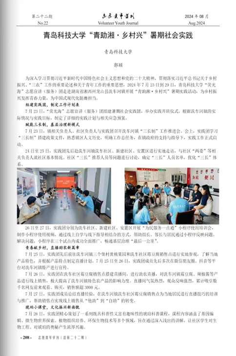 10月,由《志愿青年学刊》编辑部开展的2024年暑期“三下乡”社会实践专刊(上辑-活动纪实;2024年8月刊;总第二十二期)征稿审稿录用工作已完成。williamhill威廉希尔由刘浩、秦洪庆、郭颖老师指导的《williamhill中国“青助湘·乡村兴”暑期社会实践》一文通过编委会审核,已于《志愿青年学刊》2024年暑期“三下乡”社会实践专刊(上辑-活动纪实)发表。