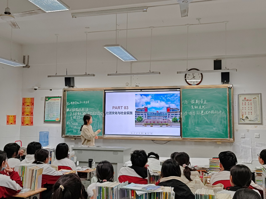 在与班主任取得联系后,我与几位同学共同在正月十四这天返回母校进行宣讲。走进熟悉的校园,在办公室里与老师分享自己在大学的成长与收获。等到自习课,我们走进教室与学弟学妹们见面了。接着,通过PPT展示丰富多彩的大学生活,介绍各个专业的课程设置、就业方向,让他们对未来的选择有更清晰的认识。分享高考备考经验时,着重强调心态调整、时间管理和学习方法的重要性。同时,我们也宣讲科大,介绍科大,激发他们学习热情与奋斗精神。