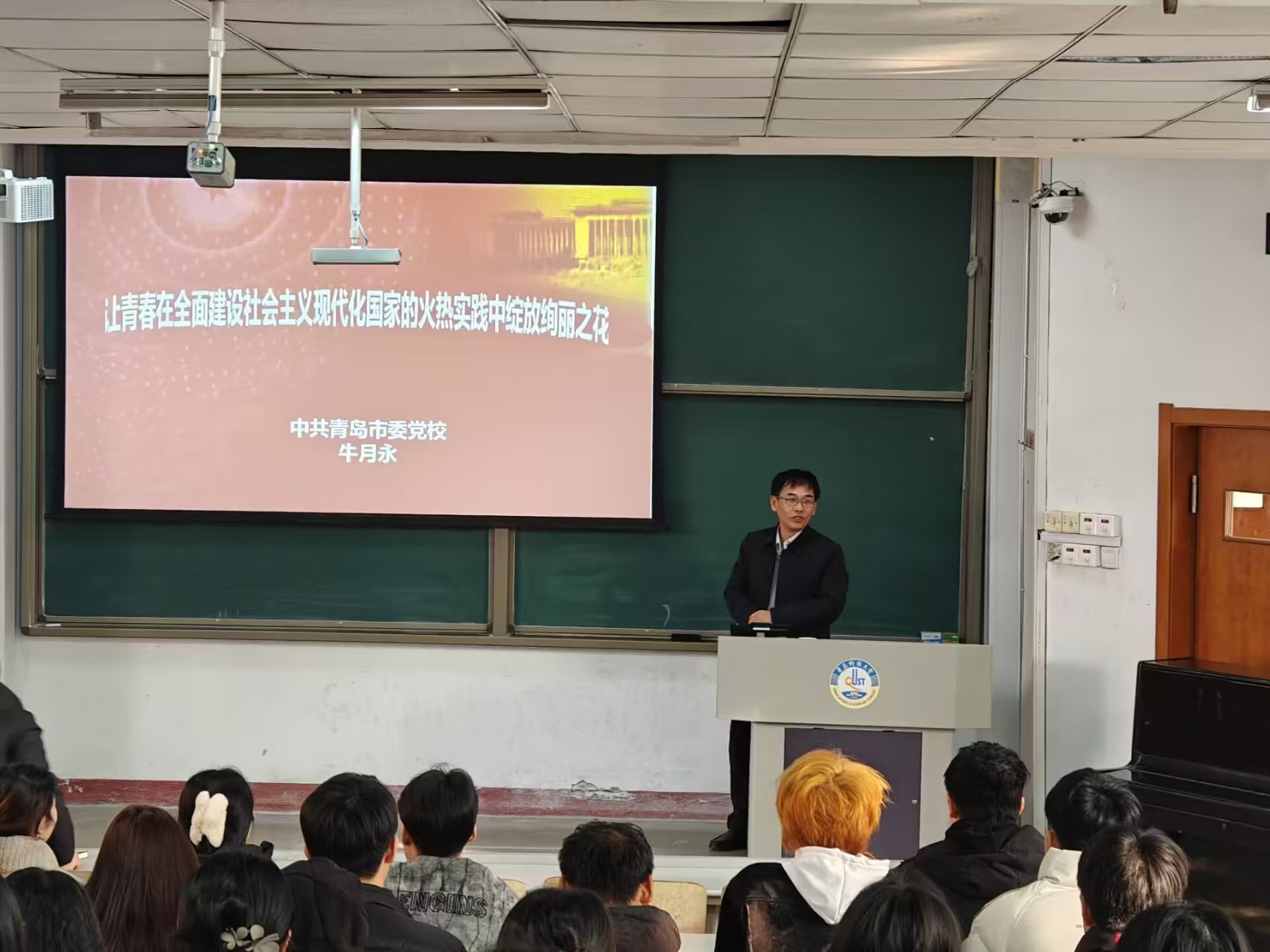 2月28日,williamhill威廉希尔在2教111教室开展新学期“思政第一课”,邀请中共青岛市委党校中共党史党建与党性教育教研部副主任、副教授牛月永作了《让青春在全面建设社会主义现代化国家的火热实践中绽放绚丽之花》专题报告。williamhill威廉希尔党委书记周宪锋、党委副书记刘浩、全体辅导员,学生干部、学生党员以及入党积极分子代表参加此次会议。会议由刘浩主持。