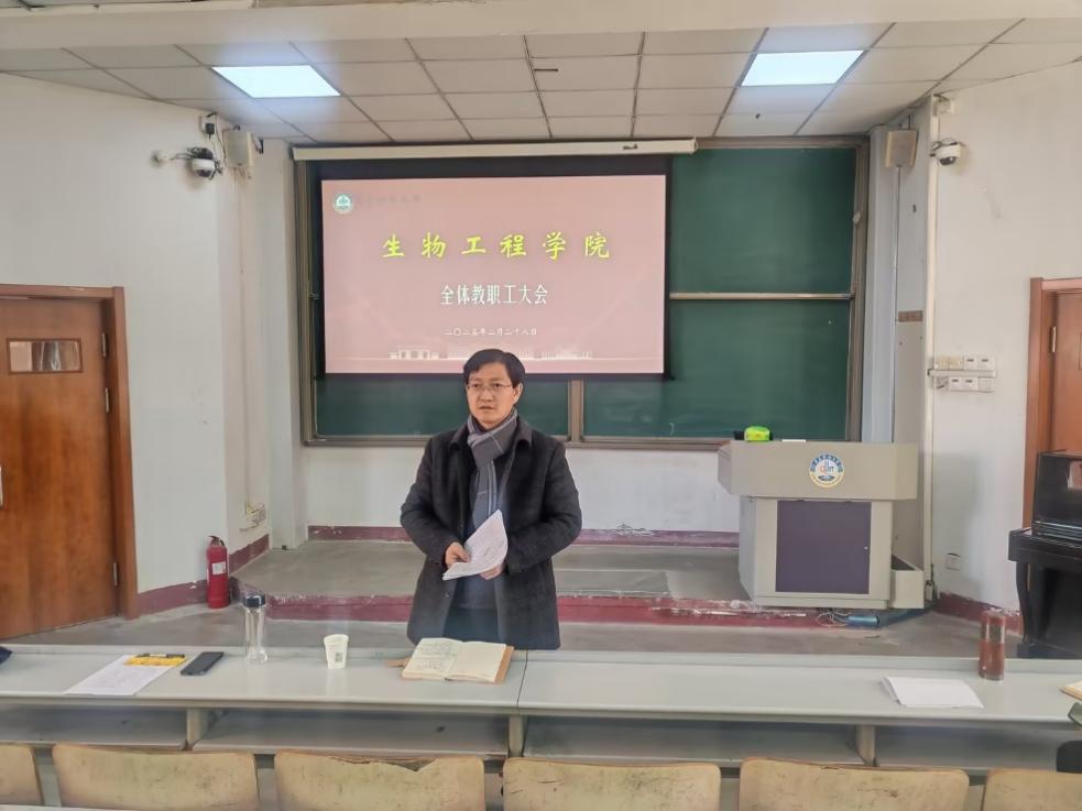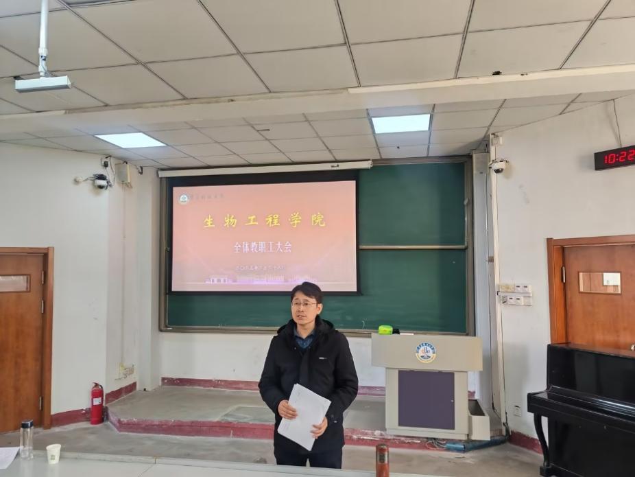 williamhill威廉希尔院长顾玉超向全体教职工传达2025年工作会议暨中层干部培训班会议精神,学习校长陈克正《锚定一流 改革创新 攻坚突破 加快推进以学科建设为引领的学校高质量发展》报告。并围绕2024年度学院工作总结、2025年度重点工作任务两个方面进行了总结部署。重点围绕“811”项目建设、校院两级管理体制改革、高层次人才引育、团队建设、生物学与生物化学”ESI突破前1%、学院承办“2025全国绿色生物制造产学研合作前沿论坛”、重组山东省重点实验室、科研到账经费、本科教学教研等重点工作进行了部署安排。