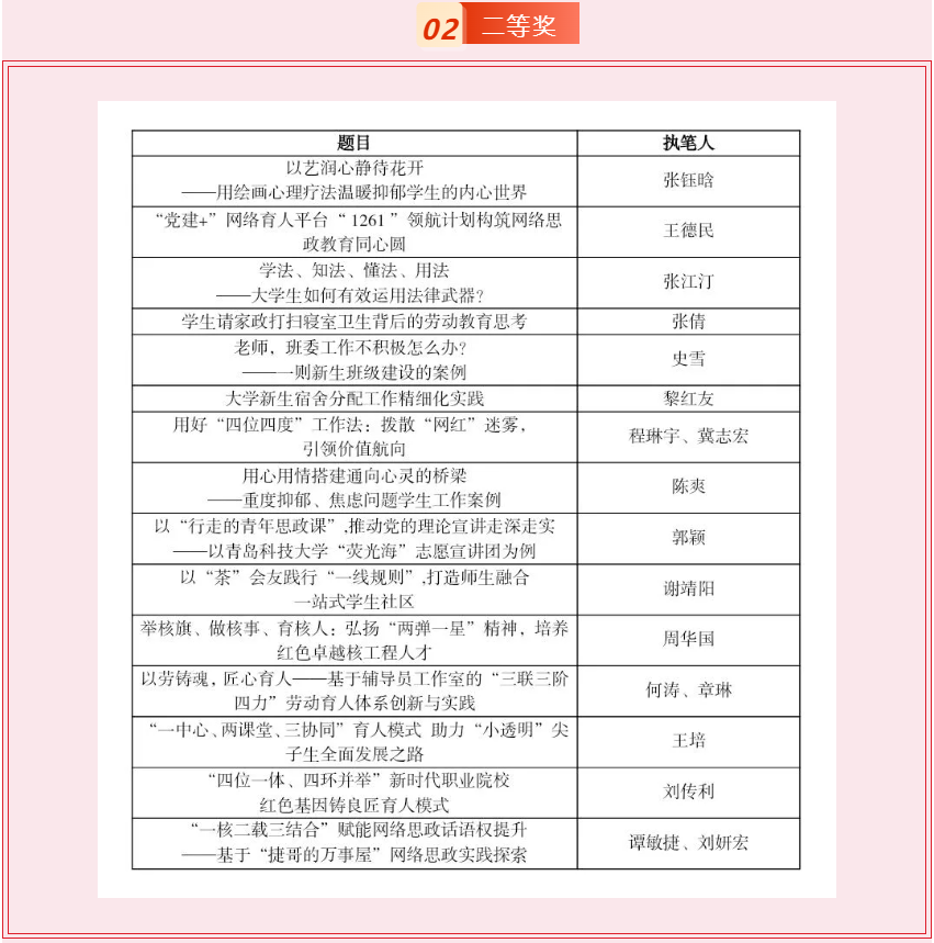 据悉,为深入学习贯彻习近平新时代中国特色社会主义思想,全面落实党的二十大和二十届二中、三中全会精神,提升高校思想政治工作队伍素质能力,切实推动高校思想政治工作高质量发展,现面向全国高校开展高校思想政治工作优秀案例征集活动,经个人申报、专家评审,共遴选出优秀案例45项,其中一等奖8项、二等奖15项、三等奖22项。