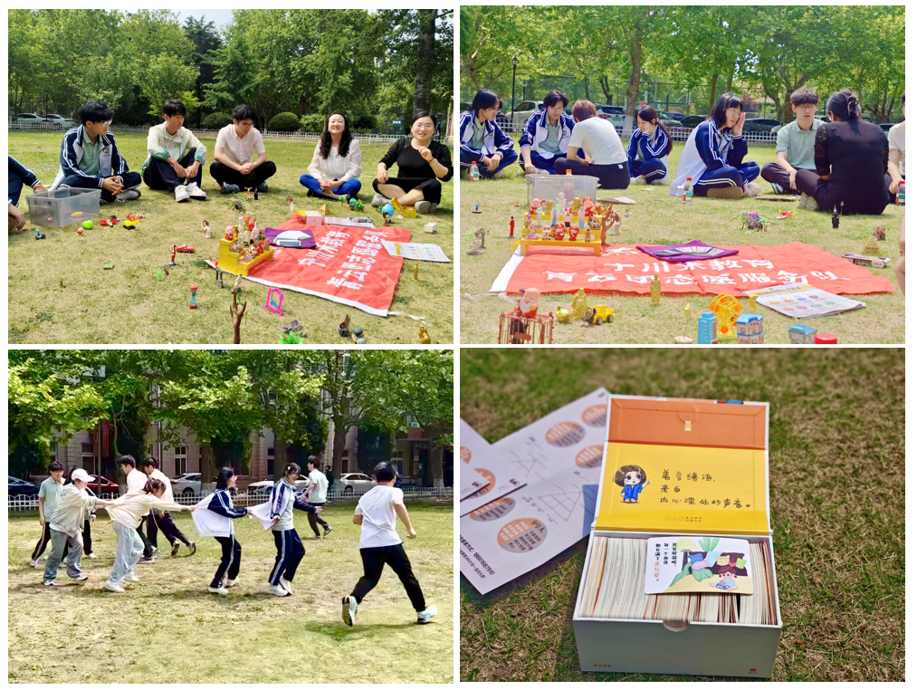 活动从阳光草坪上的自由创作拉开序幕。参与者围坐于草坪,利用积木、绿植等道具搭建充满想象力的微缩世界。看似简单的玩具组合,实则映射出内心的情感与成长轨迹。通过搭建城堡、小人等场景,学生们在童趣中完成了一次自我隐喻的表达,重拾纯真体验,为后续心理探索奠定温暖基调。