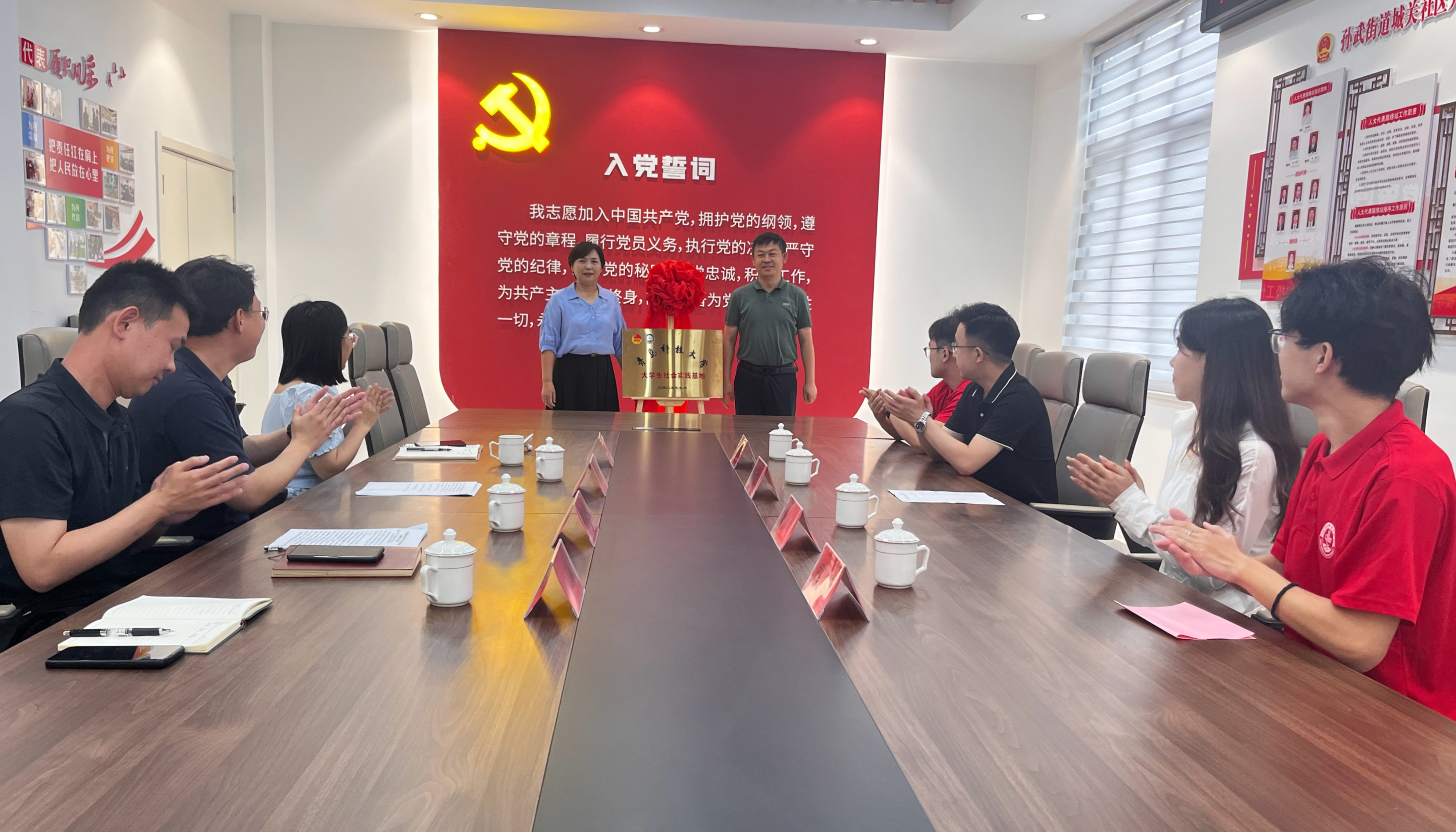 孙武街道城关社区党委书记程恩佩与秦洪庆共同为大学生社会实践基地揭牌。