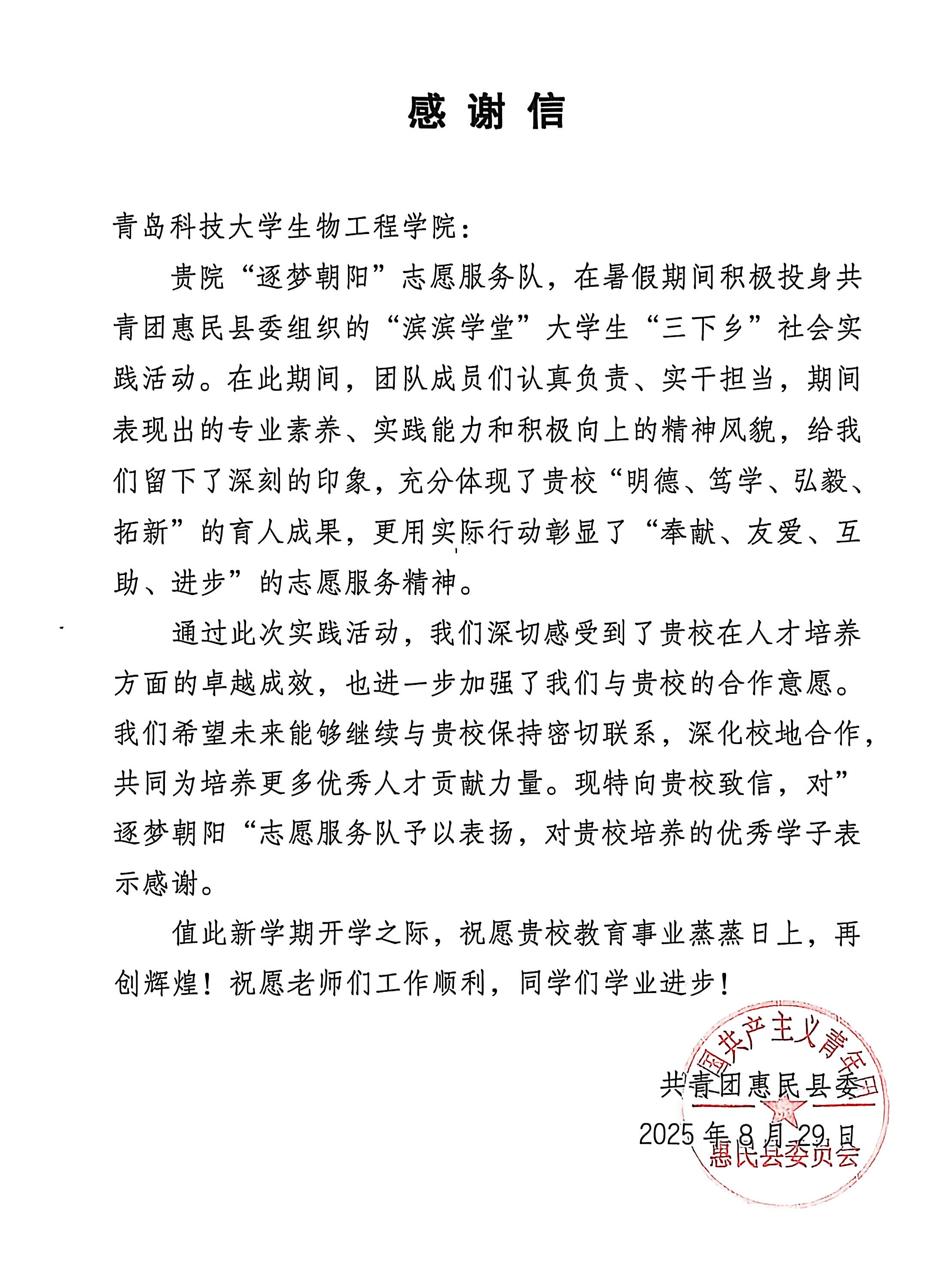 近日,williamhill威廉希尔“逐梦朝阳”志愿服务队收到了共青团惠民县委员会发来的感谢信。信中,团委对参与志愿服务的同学们给予了高度肯定和表扬,称赞他们不仅展现了当代大学生的责任感和使命感,更以实际行动为学院和社会树立了榜样。这些同学在志愿服务过程中,不畏艰难,勇于担当,用青春的热情和智慧,为惠民县的教育事业贡献了宝贵的力量,赢得了广泛的社会赞誉。