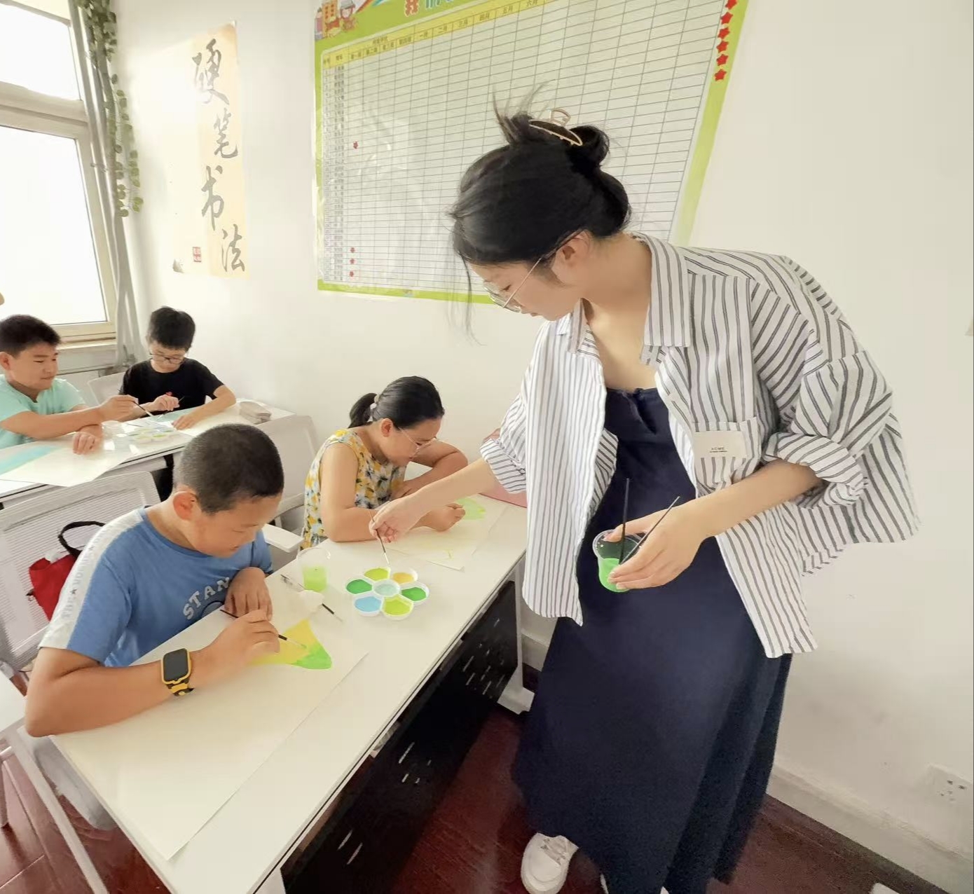 她带领孩子们执笔绘梦,从基础的握笔姿势教起,在一横一竖间体悟汉字背后的文化底蕴;通过讲述漆扇的历史与工艺,与孩子们共同动手制作出独具意义的漆扇作品。更值得一提的是,她依托合成生物学专业知识,精心设计趣味科学小课堂,将复杂的生物奥秘转化为通俗易懂的语言与实验,让科学在孩子们手中“活”了起来,真正实现了专业知识向科普资源的有效转化。