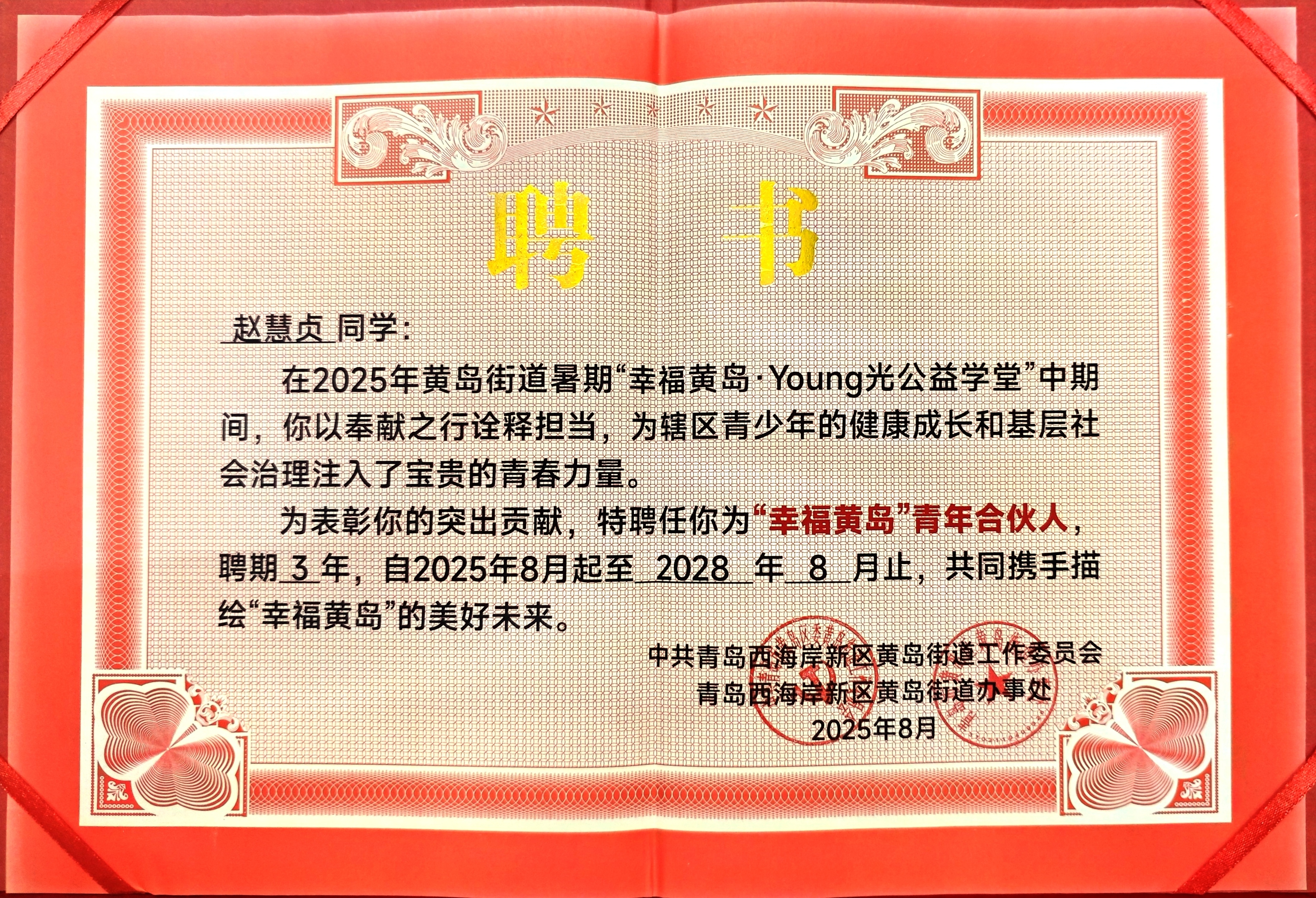 近日,williamhill威廉希尔合生241班赵慧贞同学收到青岛西海岸新区黄岛街道发出的聘书与感谢信,在“幸福黄岛・Young 光公益学堂”志愿服务中,赵慧贞充分发挥专业特长与文化素养,以“专业+文化”双轨服务模式,为辖区青少年带来富有温度与深度的暑期陪伴。