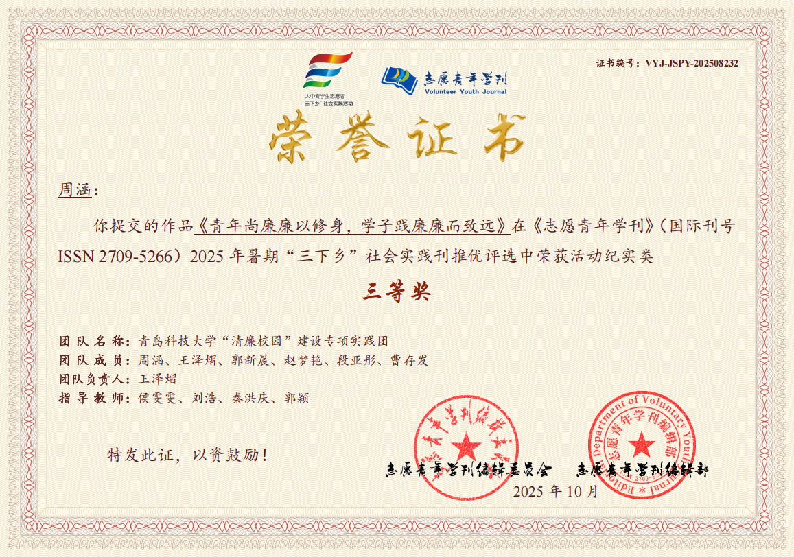 近日,《志愿青年学刊》(ISSN 2709-5266)编委会公布了2025年暑期“三下乡”社会实践专刊活动纪实类推优评选结果,williamhill威廉希尔“清廉校园”建设专项实践团获评三等奖,侯雯雯、刘浩、秦洪庆、郭颖获评优秀指导教师。