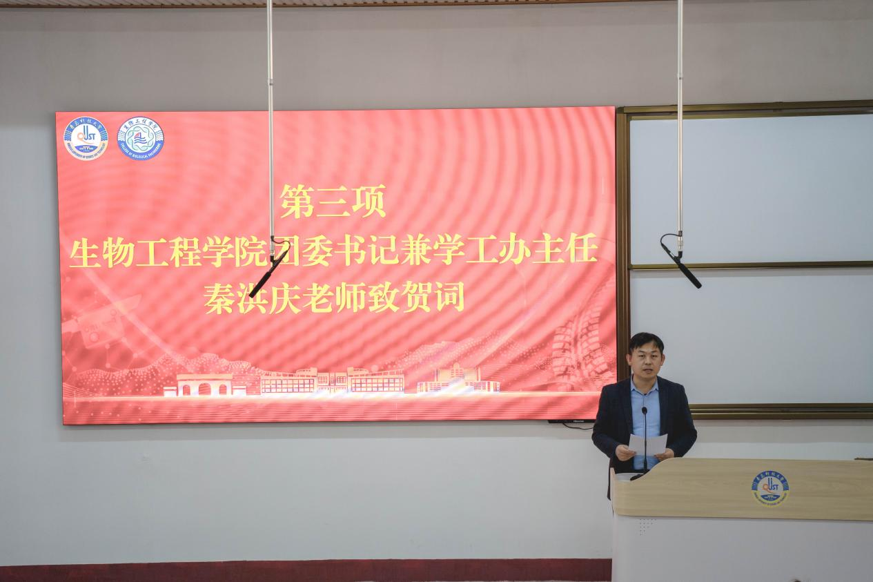 随后,秦洪庆致贺词,向大会的顺利召开表示热烈祝贺,向长期以来辛勤付出的第七届学生会、第四届研究生会成员,以及参会代表们致以诚挚问候。他表示在过去的一年里,往届学生会、研究生会以思想引领筑牢学子理想信念,用扎实行动践行了服务同学的宗旨;他强调,新一届组织要尽职尽责,做好学院与学子的沟通桥梁,全心服务同学,助力生工学子成长进步。
