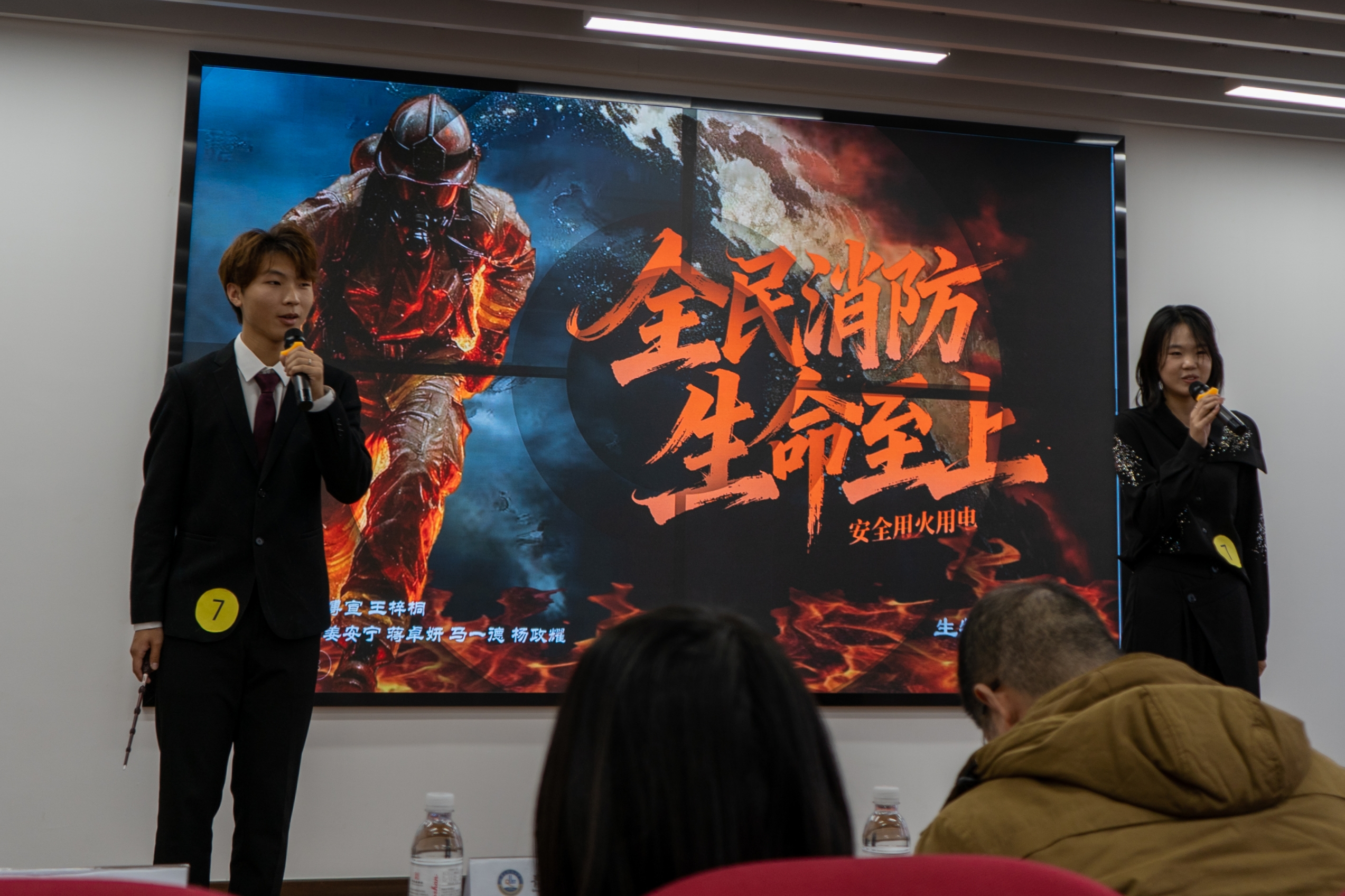 决赛分为“主题演讲、知识问答、视频展示”三个环节。在主题演讲环节,张博宣、王梓桐以“全民消防、生命至上”为主题,结合鲜活的校园生活实例,传递消防安全知识;在知识问答环节,杨政耀反应迅速、作答准确;在视频展示环节,团队以宿舍安全用电和校园吸烟为背景创作短视频,以贴近日常生活的案例引导同学们守护校园安全。