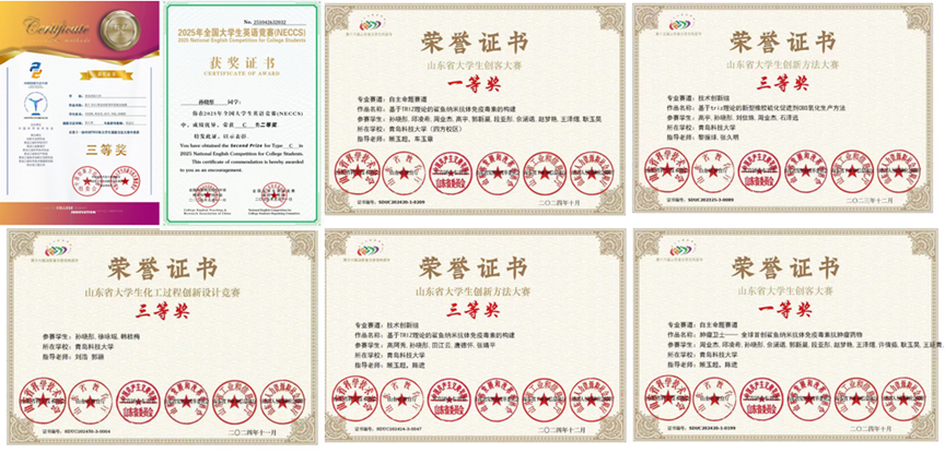 在校期间,她积极进取,累计获国家奖学金、校级一等综合奖学金、学业优秀奖学金、二等综合奖学金等奖励14项;获评青岛市千名优秀大学生、校级优秀学生、校级优秀共青团员等荣誉称号10余项。竞赛方面,获得2025年全国大学生英语竞赛国家级二等奖、第十二届中国TRIZ杯创新方法大赛国家级二等奖等国家级奖励3项;2024“建行杯”山东省大学生创新创业大赛省级银奖、第九届山东省大学生创客大赛省级一等奖等省级奖励8项;第十四届挑战杯创新创业比赛校级一等奖等校级奖励4项。