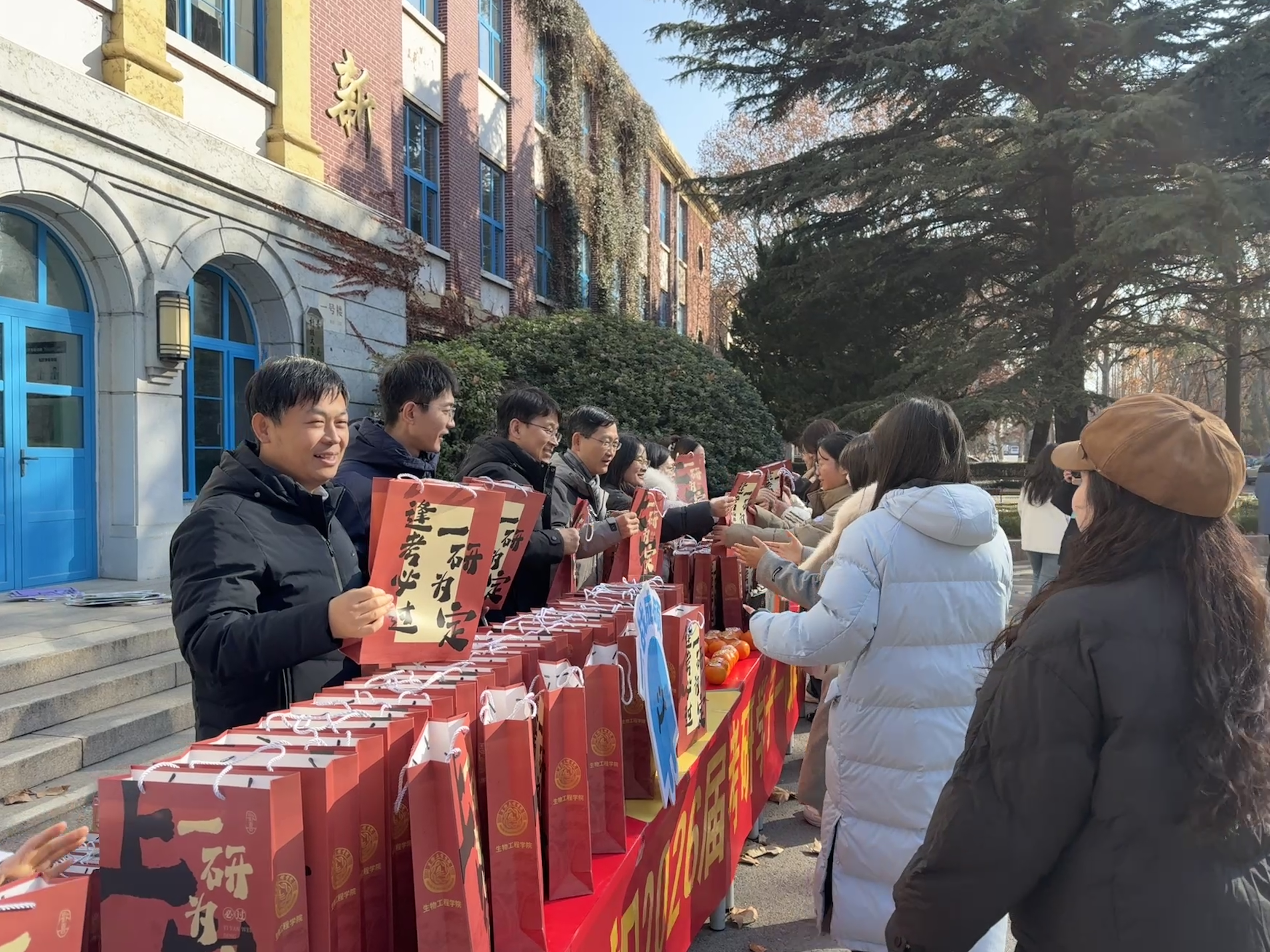 学院党委书记周宪锋、院长顾玉超、党委副书记兼副院长刘浩、副院长孟祥民、团委书记兼学工办主任秦洪庆及各年级辅导员、2022级班主任代表学院为2022级考研学子们分发礼包,这份“考研礼包”中藏着满满的“夺冠密码”:饱满橙子寓意着“橙风破浪,一举成硕”,愿学子们考场披荆斩棘、势不可当;香甜旺仔牛奶承载着“旺力全开,高分上岸”的祝福,盼大家发挥超常、实力爆棚;简约实用的笔记本,寄托着“笔耕不辍,研途笃行”的期许,愿学子们在逐梦路上沉淀每一份积累;贴心暖宝宝化身“备考铠甲”,为挑灯夜战的追梦人驱散寒意,守护每一份专注与坚守。学院始终关注考研学子的备考状态,此次礼包发放既是对大家坚持与付出的肯定,更是对学子们金榜题名的殷切期盼。