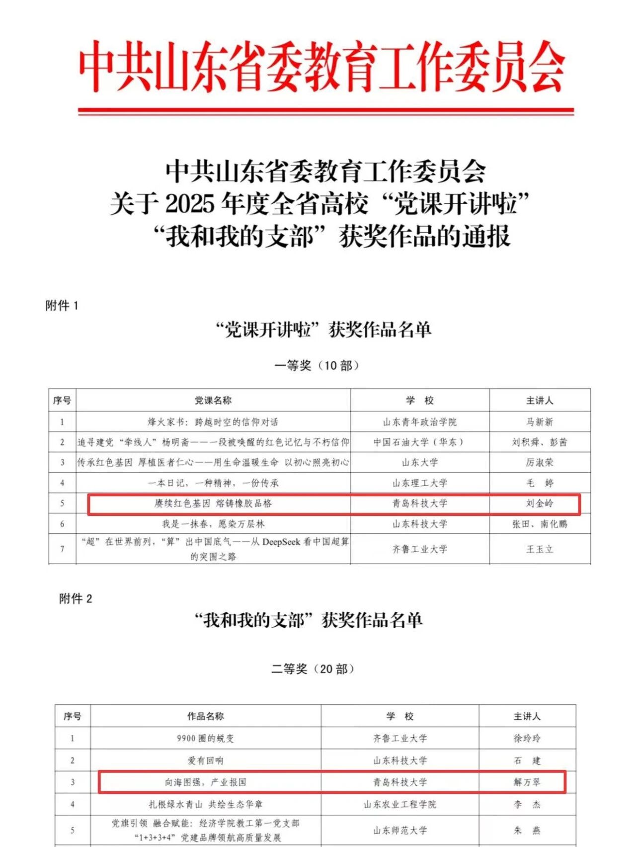 据悉,中共山东省委教育工作委员会《关于做好2025年度全省高校“党课开讲啦”“我和我的支部”申报工作通知》下发后,各高校精心组织创作,积极遴选推荐,经学校申报、专家评审、集体研究、结果公示,评选出“党课开讲啦”优秀作品60部、“我和我的支部”优秀作品60部。