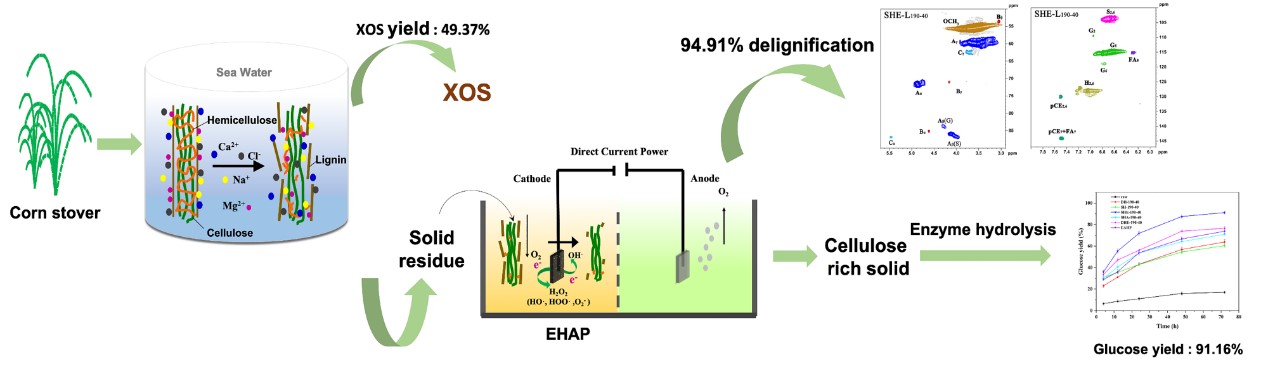 在此基础上,该团队提出了一种新颖的海水水热-电催化两步预处理技术,基于半纤维素优先策略实现了秸秆全组分的精准拆解与高效转化,同时制备低聚糖、可发酵性糖和小分子量木质素化合物,并揭示了主要组分的降解转化机制。相关研究成果以“Promising seawater hydrothermal combining electro-assisted pretreatment for corn stover valorization within a biorefinery concept”为题目,发表在生物质领域国际知名期刊Bioresource Technology (Bioresource Technol. 2022, 351:127066. IF= 11.889,中科院一区TOP期刊)。论文第一作者为海洋学院硕士研究生吴越,通讯作者为吉喆副教授,williamhill中国为第一单位和唯一通讯单位。该项工作得到了国家自然科学基金、山东省重大创新工程的资助。