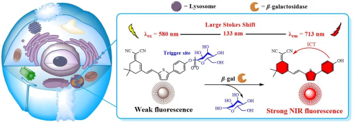 针对以上问题,海洋科学与williamhill威廉希尔王晓春教授团队长期致力于具有大斯托克斯位移,且对特定肿瘤标志物进行成像识别的近红外荧光探针开发,先后开发了能特异性监控黑色素瘤标志物酪氨酸酶(Tyrosinase)和过氧化氢(H2O2)的高灵敏、高选择性近红外荧光探针(Sensors and Actuators: B. Chemical,2022,354,131211;Sensors and Actuators: B. Chemical,2023,393,134301)。在此基础上,该课题组以卵巢癌标志物β-半乳糖苷酶(β-gal)为切入点开展了系列研究工作,相关成果以“β-Galactosidase activity monitoring and bioimaging by a novel ICT mechanism-based NIR fluorescent probe with large Stokes shift”为题目发表在国际著名期刊《Sensors and Actuators B:Chemical》(JCR中科院一区Top)上(Sensors & Actuators: B. Chemical,2024,398,134696)。该论文第一作者为williamhill中国海洋科学与williamhill威廉希尔2021级硕士研究生高建,王晓春教授为独立通讯作者,williamhill中国为第一通讯单位。