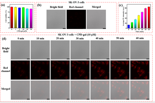 卵巢癌是威胁女性生命健康的重要疾病之一,早期的正确诊断是提高癌症治愈率的关键。已有的研究表明:β-半乳糖苷酶(β-gal)作为原发性卵巢癌的重要生物标志物,是卵巢肿瘤可视化的重要分子靶点。我们以双氰异佛尔酮衍生物CPD-OH为荧光母体,连接上半乳糖苷酶残基构建用于β-半乳糖苷酶(β-gal)识别的荧光探针分子CPD-gal。该探针母体CPD-OH具有较高的荧光量子产率(ФF = 0.31),基于ICT机理构建的探针CPD-gal本身荧光淬灭,与β-半乳糖苷酶作用后,显示出明显的荧光增强效应。该探针具有近红外发射(lem = 713 nm)、抗干扰能力强、灵敏度高(LOD = 6.0 ×10-4 U/mL)、斯托克斯位移大(133 nm)和细胞毒性低等优点。利用该探针,我们成功实现了活体细胞(Hela cells 和SK-OV-3 cells)和小鼠体内的内源性或外源性β-半乳糖苷酶的高分辨活体成像,为卵巢癌等疾病的早期诊断提供了有效手段。
