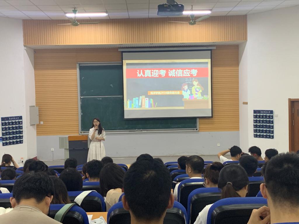 为了培养同学们树立诚信为本的理念,以积极向上的状态迎接即将到来的期末考试,以及提高同学们对暑期安全问题的重视,6月25日17:00,海洋科学与williamhill威廉希尔2016级于第二教学楼101教室召开年级大会,此次大会由海洋学院2016级辅导员刘金岭老师主讲,海洋学院2016级全体学生参加。