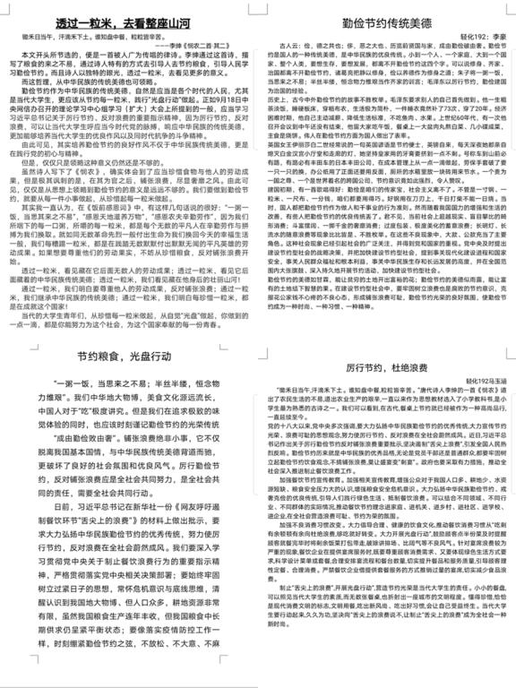 为加大宣传力度,将“勤俭节约,珍惜粮食”的思想深入落实,学院组织开展“节约粮食”主题征文,力求以文字的方式,深化同学们对勤俭节约,杜绝浪费的认识。