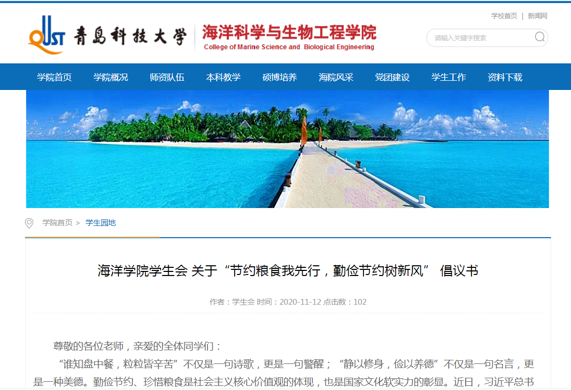 勤俭节约是中国优良的传统美德,为深入贯彻习近平总书记关于坚决制止餐饮浪费行为的重要指示精神,培养学生养成勤俭节约的好习惯,在全院营造浪费可耻、节约为荣的良好氛围,引领带动校园文明新风尚,海洋学院积极作为,主动部署,扎实有效开展“制止餐饮浪费 培养节约习惯”专题教育活动。