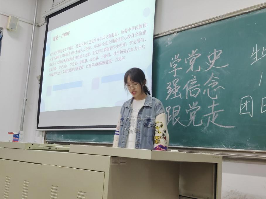 会议初始,首先由班级团支书赵若云为同学们讲解“为什么学习党史”“党史有哪些”以及“什么样的人才能加入中国共产党”这些问题。她帮助同学们端正思想,坚定初心和使命,呼吁每一位同学自发自主的学习党的历史,将所学转化为行动,将前辈的革命精神转化为自己奋斗的动力。