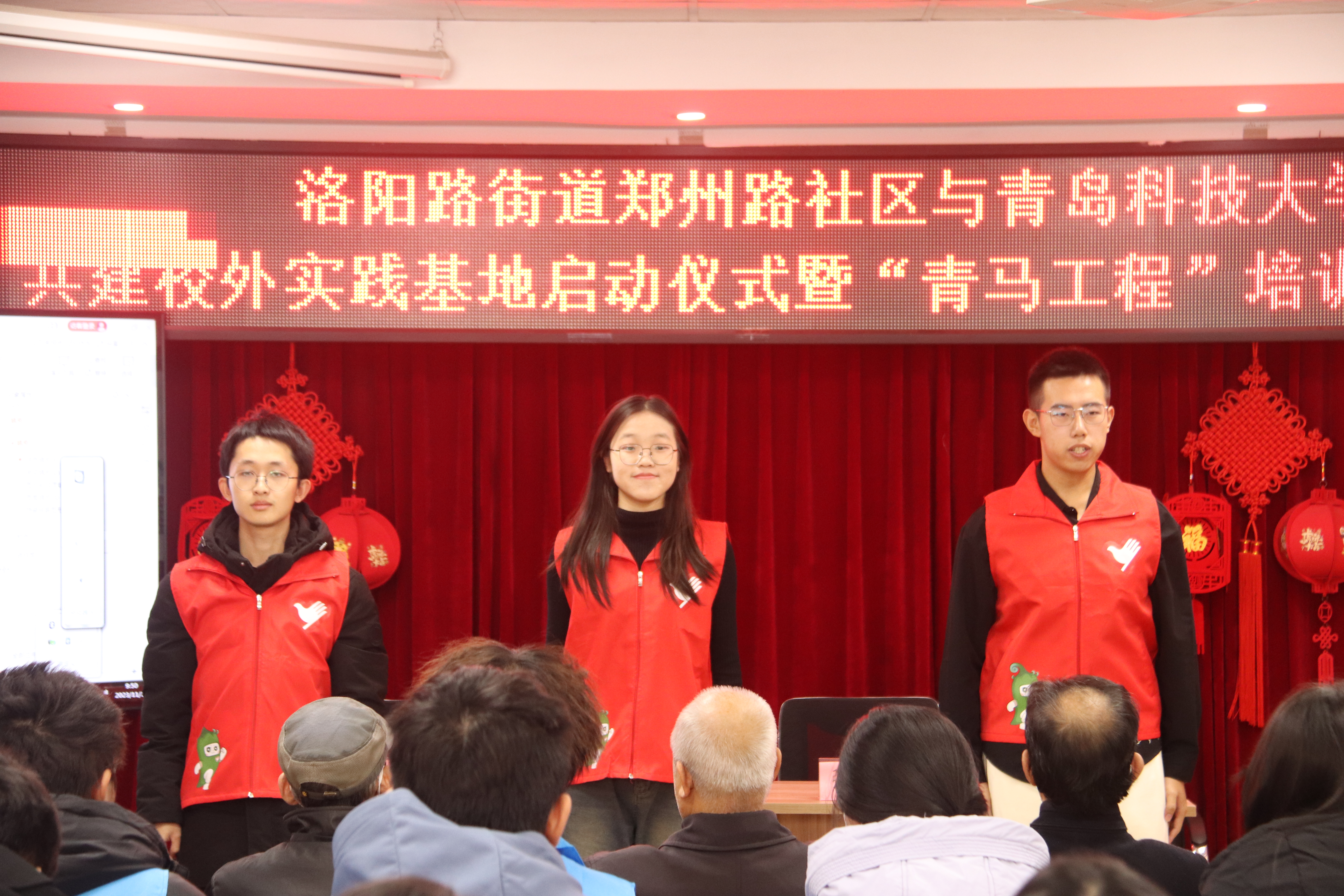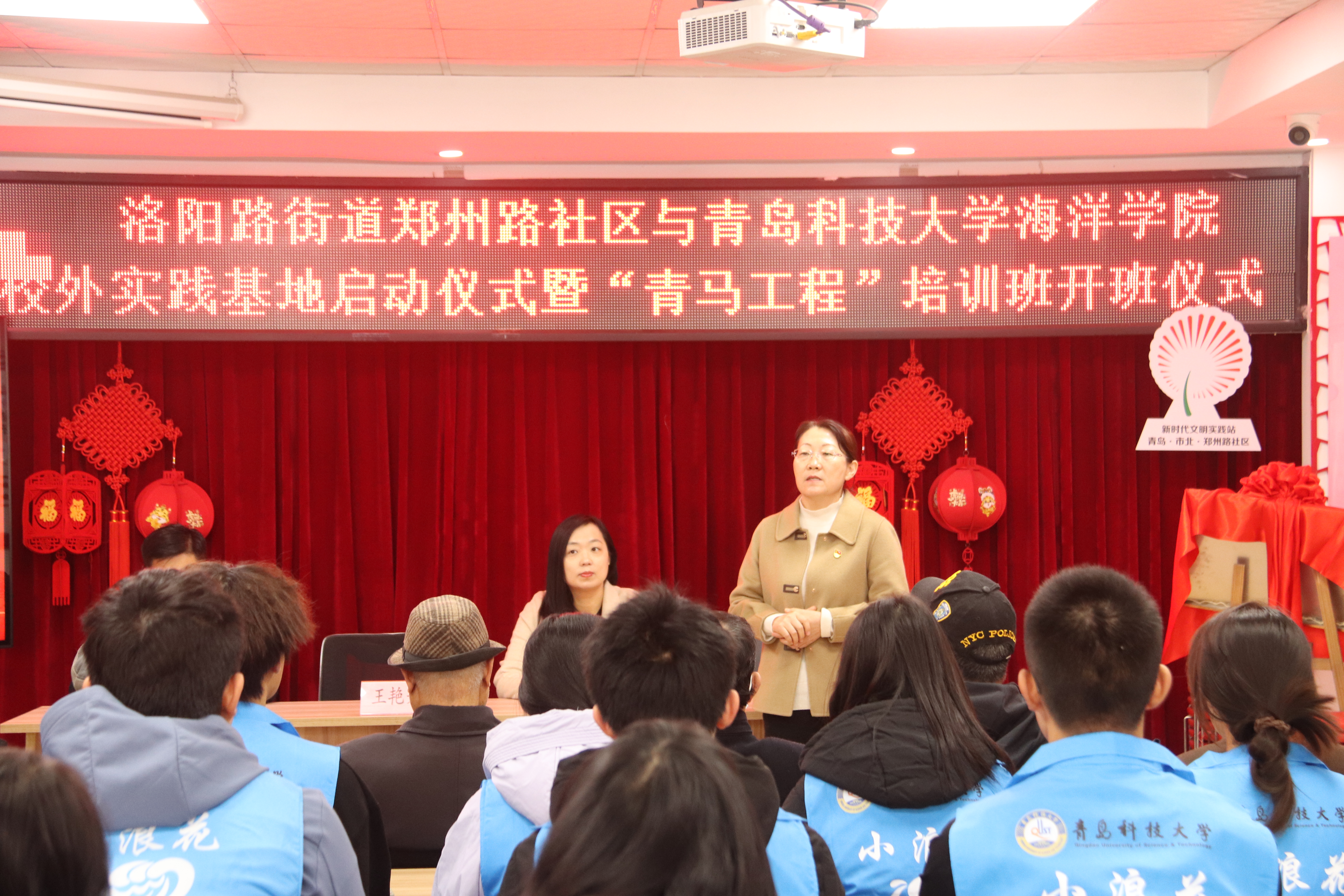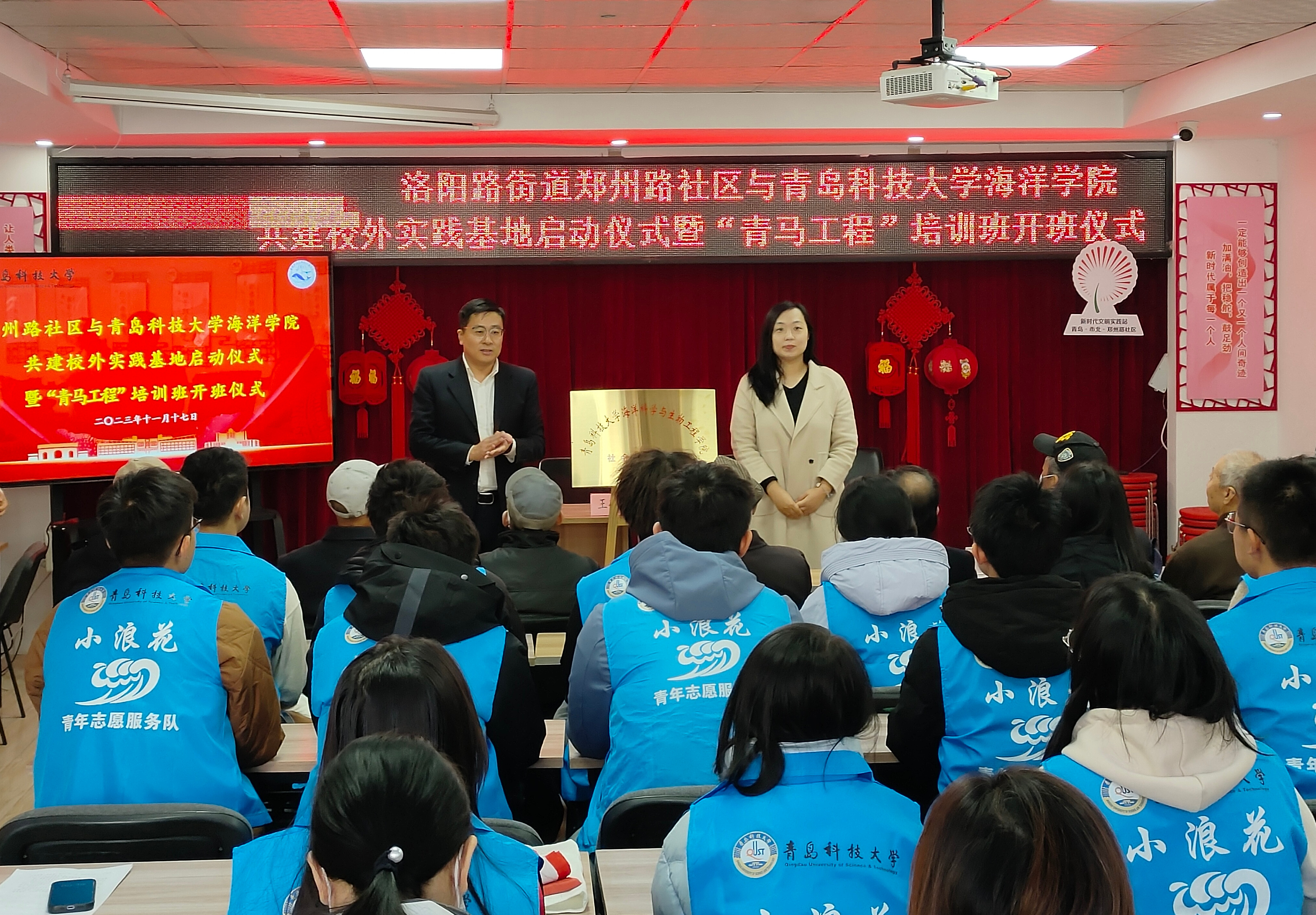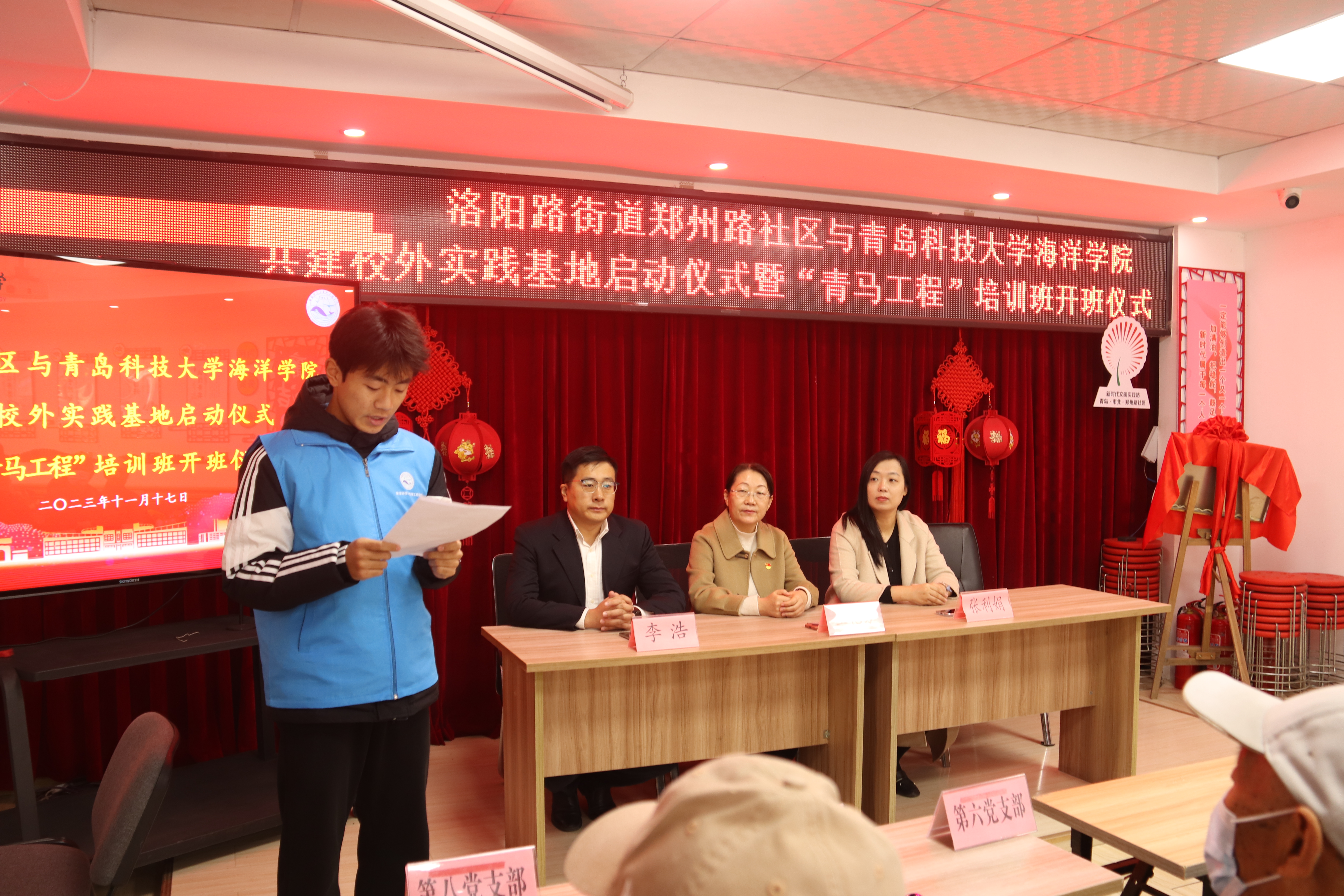 为全面落实习近平总书记关于青年工作的重要思想,进一步推进学院“青马工程”建设,引导广大青年学子在基层实践中受教育、长才干、做贡献,实现青年人才发展与基层治理创新齐头并进,11月17日,海洋学院2023年秋季“青马工程”培训班开班仪式暨校外实践基地启动仪式在洛阳路街道郑州路社区举办。洛阳路街道办事处副主任张利娟、海洋学院团委书记李浩、郑州路社区党委书记王艳芳出席活动,海洋学院青马学员、郑州路社区网格长和党员群众代表30余人参加活动。