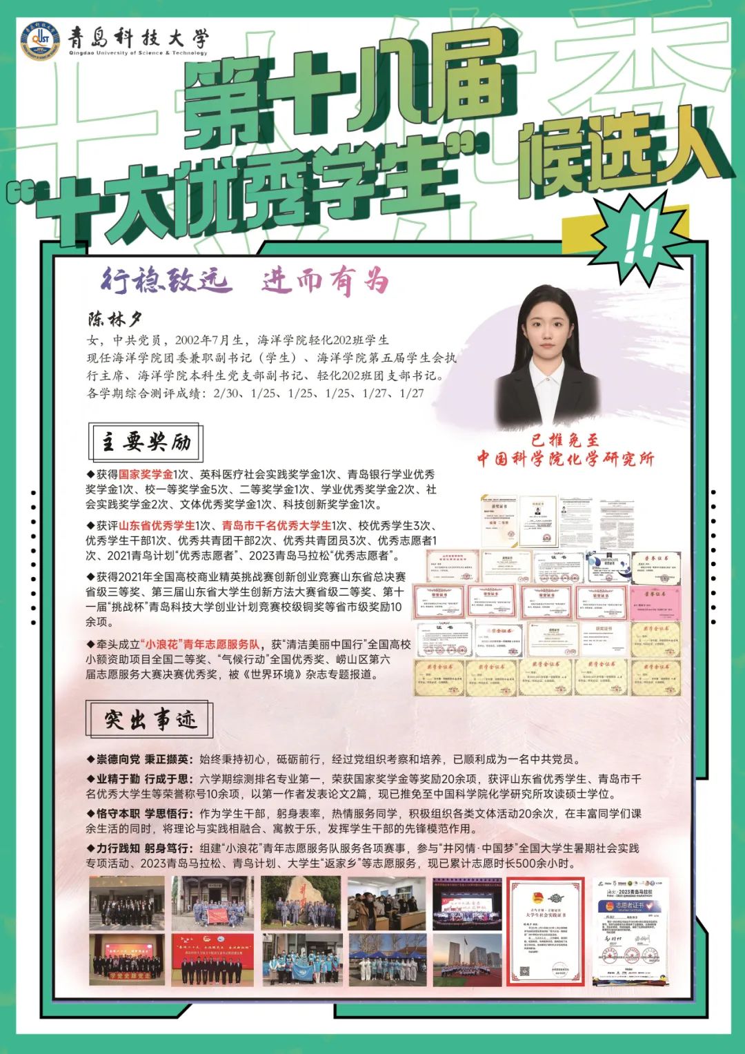 根据《williamhill中国本专科学生荣誉奖管理办法》(青科大字〔2022〕114号)和《williamhill中国关于评选第十八届“十大优秀学生”的通知》(青科大学字〔2023〕39号)要求,结合学校实际,按照公开、公正、择优的原则,经学院(校区)推荐、资格审核、网络投票、现场汇报、民主投票等环节,海洋学院轻化202班陈林夕获评williamhill中国第十八届“十大优秀学生”。