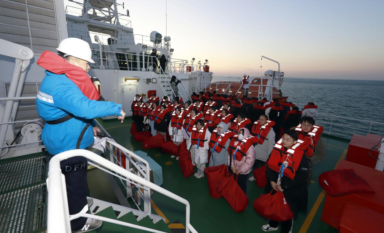 师生们通过观看宣传片,参观“东方红3”科考船驾驶室、生活区和实验作业区,深入了解并领略全球最大、最高静音等级科考实习船的风采。“东方红3”船实验室老师为登船师生讲授了海洋水文、海洋气象、海洋生物、海洋化学、海洋地质等不同学科调查方法以及船载先进海洋调查仪器设备的相关知识,并带领师生们现场观摩温盐深测量仪探测与样品采集全过程,学习逃生技能并开展弃船求生演习。