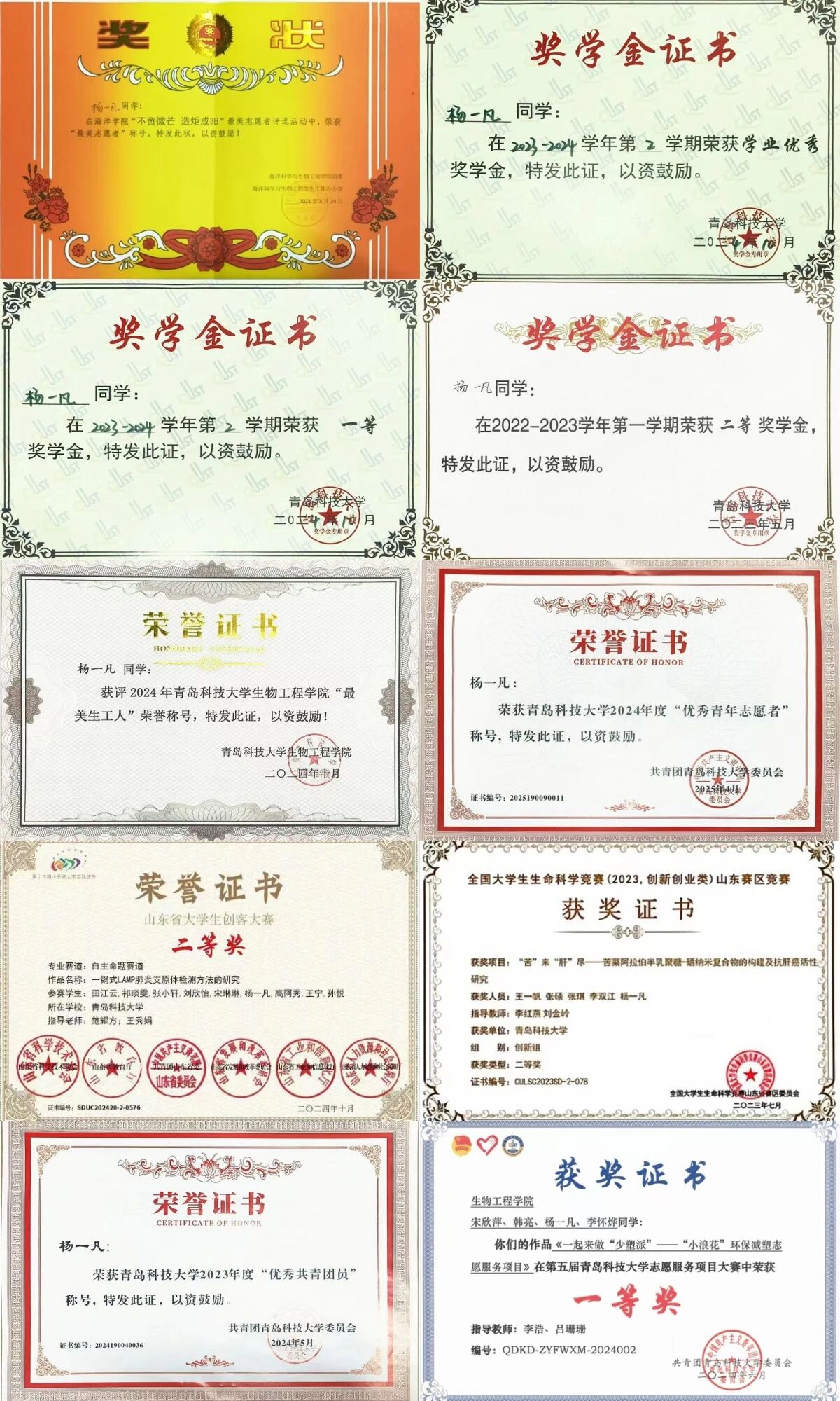 2023-2024学年学业优秀奖学金、校⼀等奖学金;校优秀共金团员、优秀志愿者、最美海洋人荣誉称号