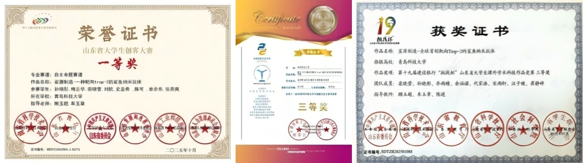 在校期间,她积极进取,前六学期学业成绩与综测成绩均位于专业第一名,目前累计获国家奖学金、校级一等综合奖学金、学业优秀奖学金、二等综合奖学金等奖励14项;获评青岛市千名优秀大学生、校级优秀学生、校级优秀共青团员等荣誉称号10余项。竞赛方面,获得2025年全国大学生英语竞赛国家级二等奖、第十二届中国TRIZ杯创新方法大赛国家级二等奖等国家级奖励3项;2024“建行杯”山东省大学生创新创业大赛省级银奖、第九届山东省大学生创客大赛省级一等奖等省级奖励8项;挑战杯创新创业比赛校级一等奖等校级奖励10项。在科研方面,她坚持开拓创新,目前以第一作者身份在北大中文核心期刊等期刊发表论文3篇,申请国家专利3项。