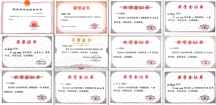 国家奖学金、全国大学生英语竞赛国家级二等奖、第十二届中国TRIZ杯创新方法大赛国家级二等奖、第十一届中国TRIZ杯创新方法大赛国家级三等奖、中国国际大学生创新创业大赛省级银奖两项、挑战杯山东省大学生课外学术作品展示竞赛省级铜奖、山东省大学生创新方法大赛省级三等奖两项、山东省大学生创客大赛省级一等奖三项、山东省大学生化工过程创新设计竞赛省级三等奖两项。获校级一等综合奖学金、学业优秀奖学金、二等综合奖学金、科技创新奖学金等奖励二十余项;获青岛市千名优秀大学生、校级优秀学生、校级优秀学生干部、校级优秀共青团员、“最美海洋人”“最美生工人”等荣誉称号十余项。