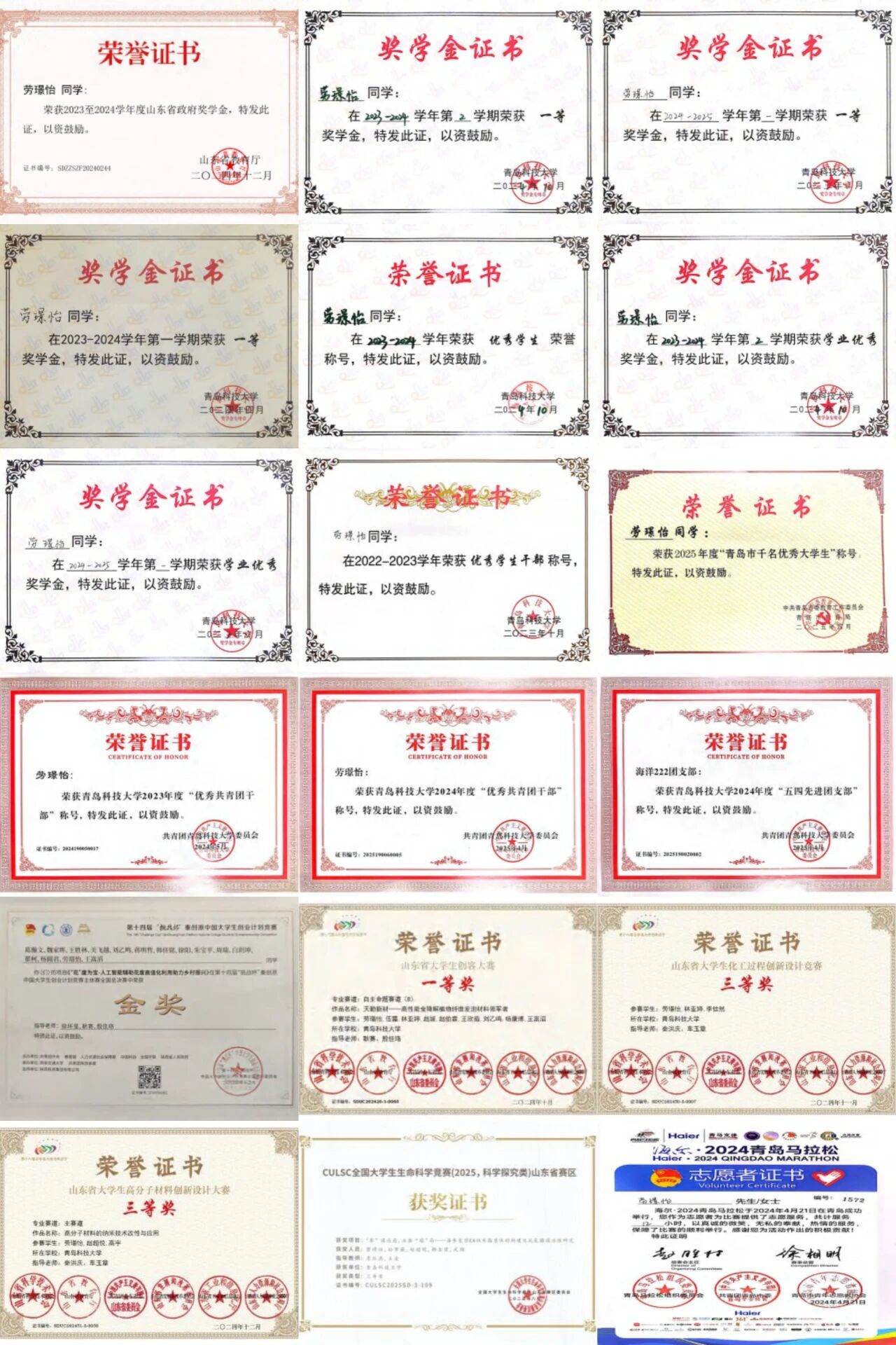 获青岛市千名优秀大学生、校级优秀学生、校级优秀学生干部、校级优秀共青团干部、最美生工人等荣誉称号;