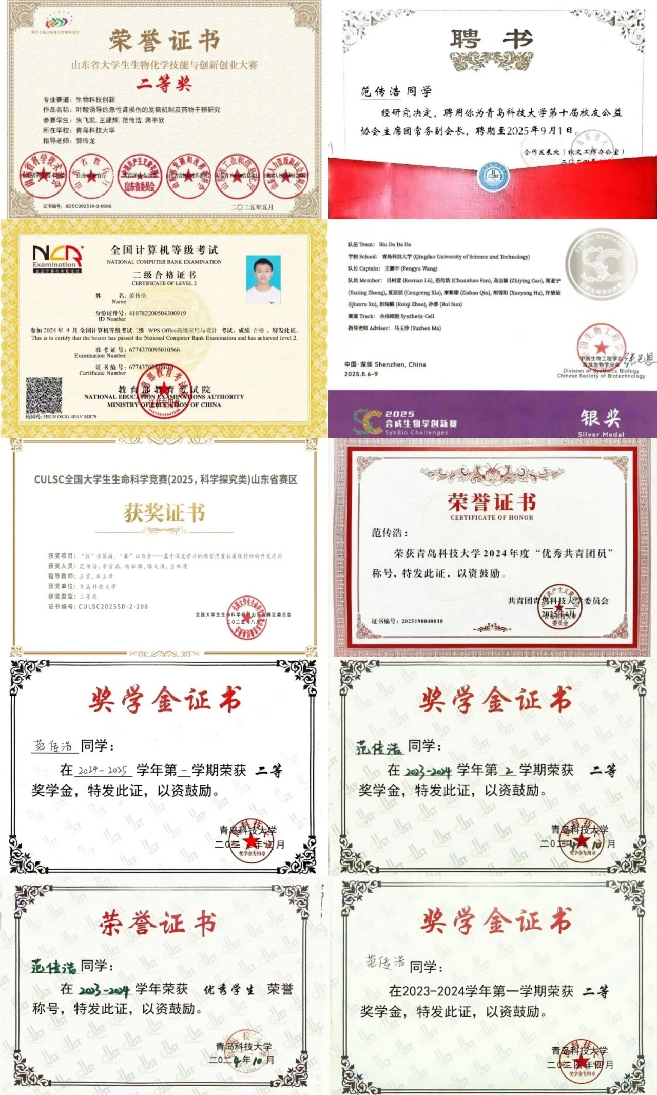 2024-2025学年第二学期获一等综合奖学金;学业优秀奖学金;“优秀学生”荣誉称号;“最美生工人”荣誉称号