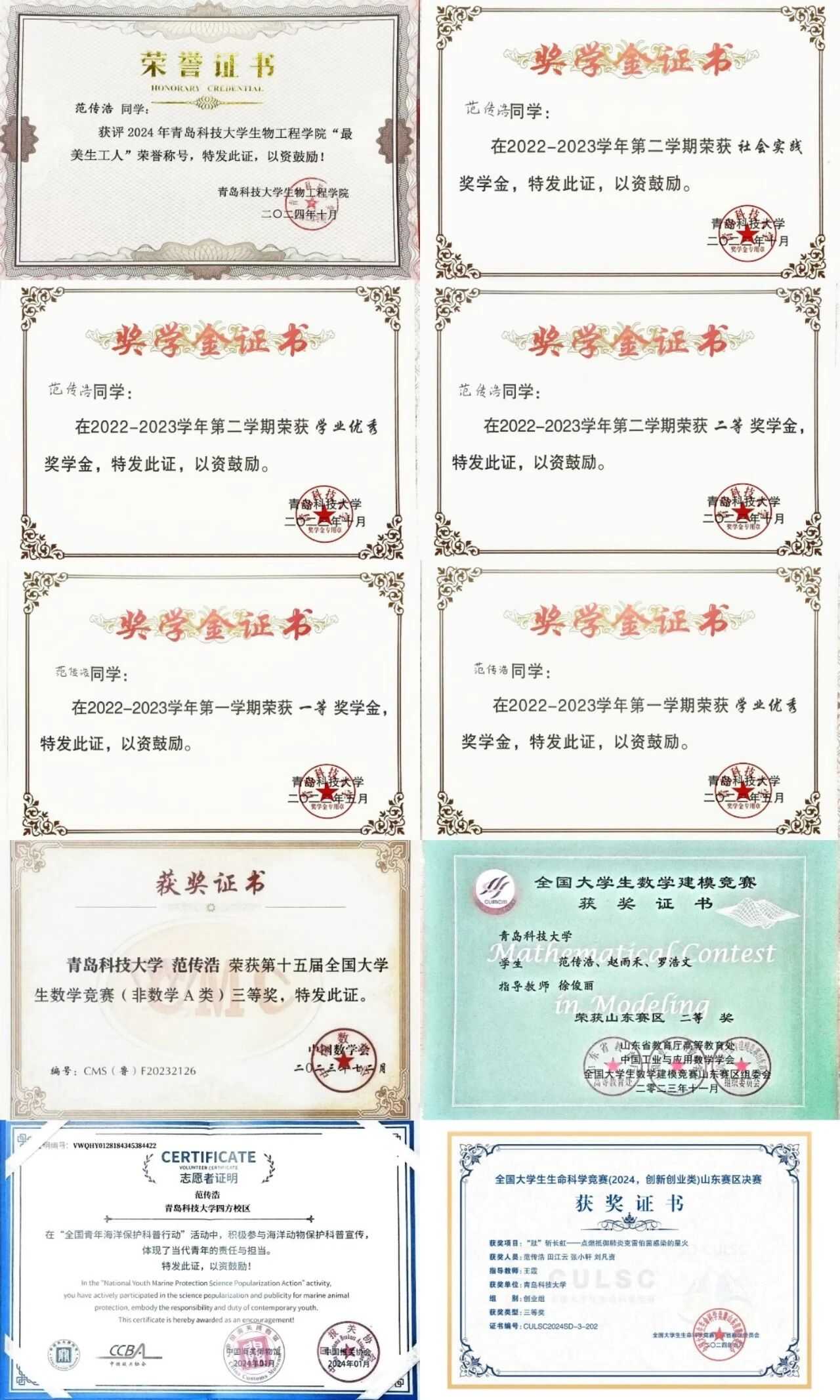 2023-2024学年第二学期获校内二等奖学金;“优秀学生”荣誉称号 ;“最美生工人”荣誉称号