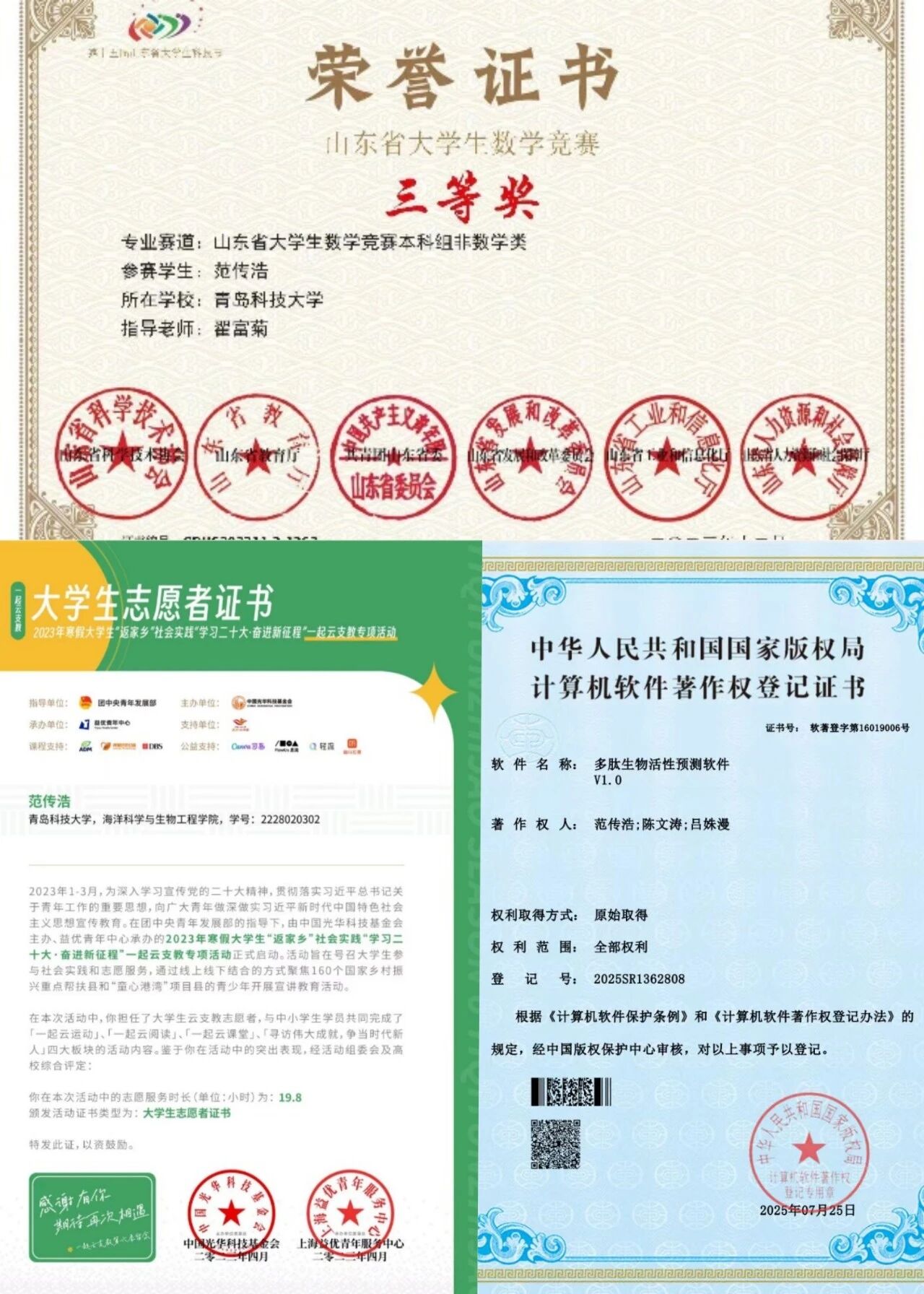 科研上,他积极投身于科研与创新实践,大二便进入实验室跟随导师从事抗菌肽有关的项目研究,曾作为核心成员参与2023年省级大学生创新创业训练计划一项(已结项),并作为第一作者发表软著《多肽生物活性预测软件》。自己的动手能力、实验操作技能以及科研相关书面写作能力得到了极大锻炼。