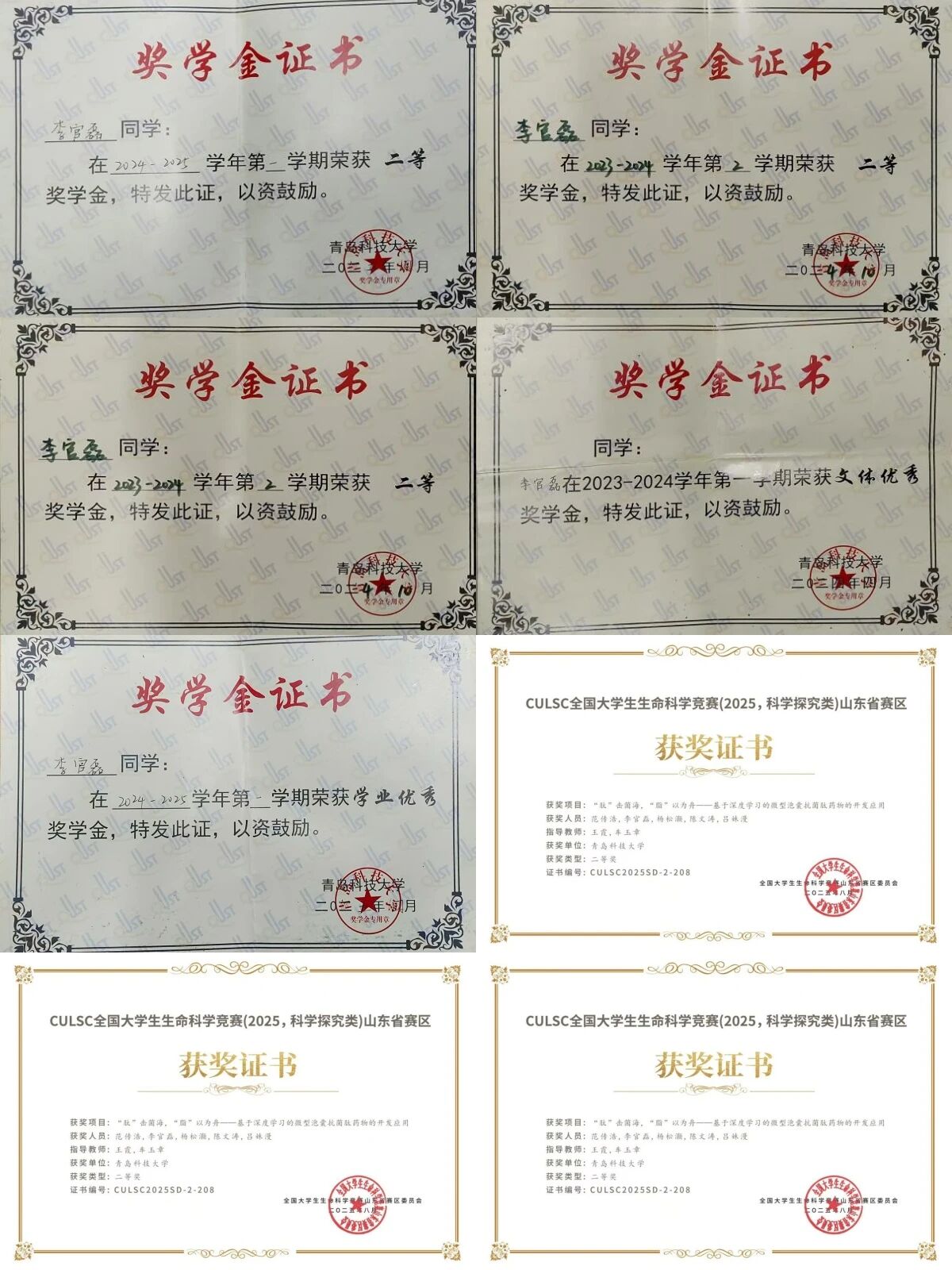 全国大学生生命科学竞赛(2024,科学探究类)山东省赛区三等奖;山东省大学生创客大赛三等奖;全国大学生生命科学竞赛(2025,科学探究类)山东省赛区二等奖;山东省大学生生物学大赛二等奖;