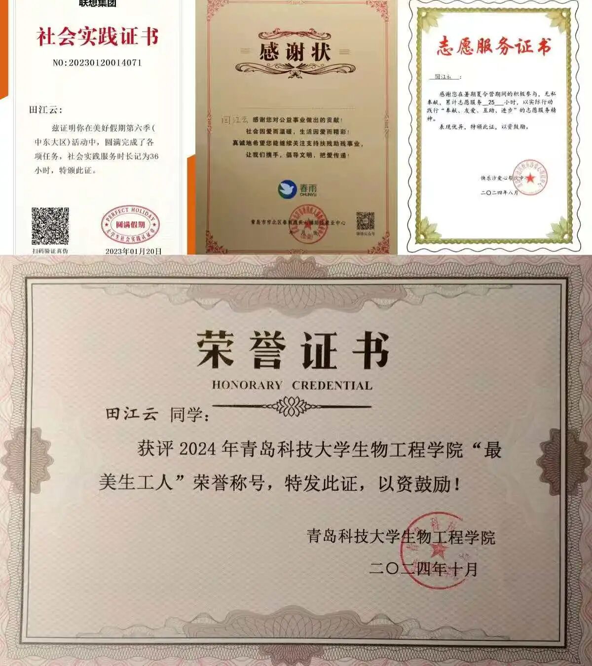 获校级优秀学生、校级优秀学生干部、校级优秀青年志愿者、校级社会实践优秀学生、最美生工人等荣誉称号;