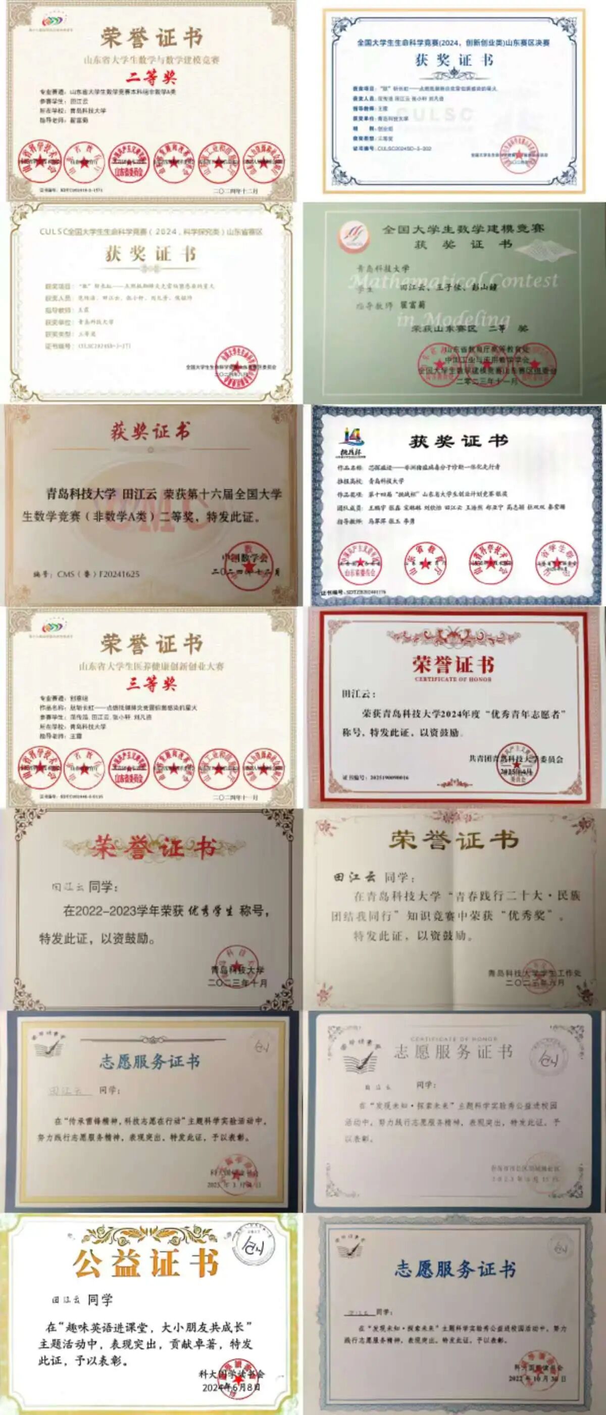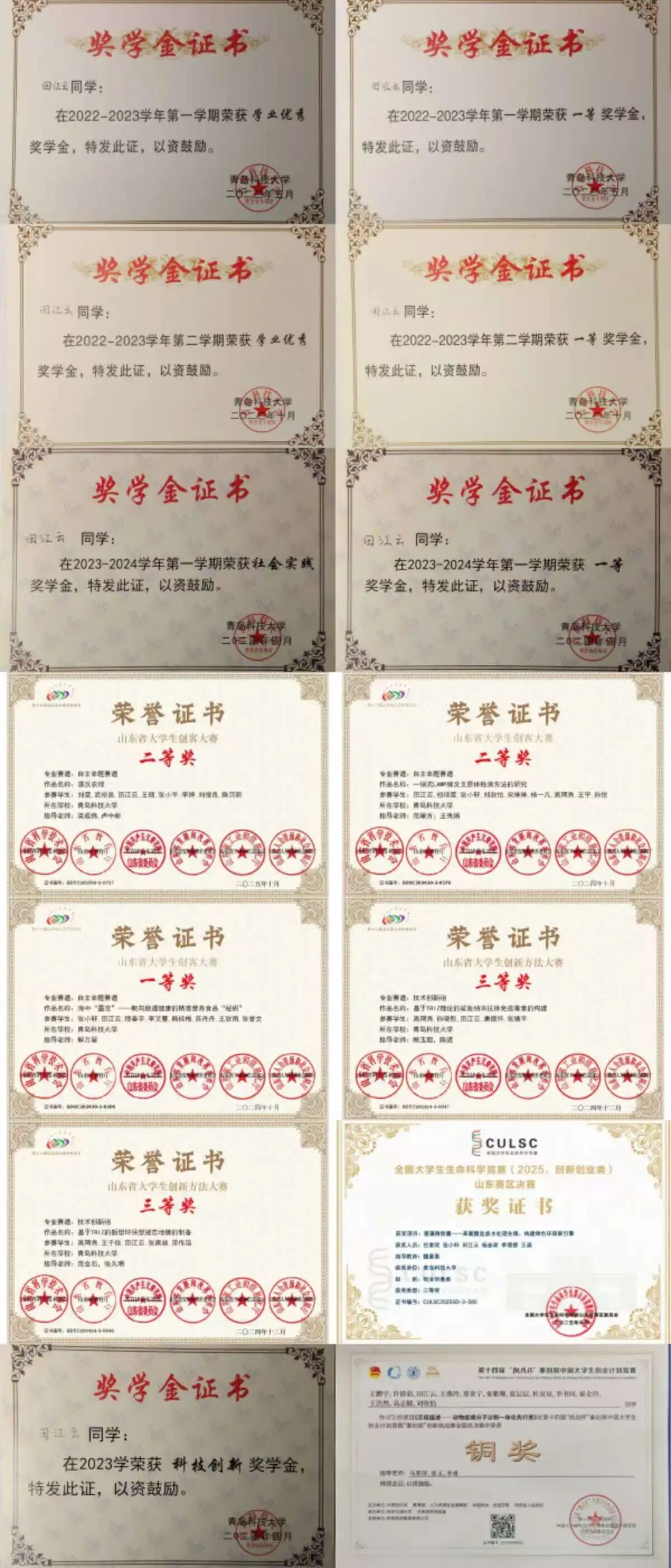 荣获“挑战杯”秦创原创新挑战赛国家级铜奖、全国大学生数学竞赛国家级二等奖、全国大学生数学建模竞赛省级二等奖、中国国际大学生创新大赛省级铜奖、第十四届“挑战杯”大学生创业计划竞赛主赛道省级银奖、山东省大学生医养健康创新创业大赛三等奖、山东省大学生创客大赛一等奖,二等奖、第九届全国大学生生命科学竞赛(科学探究类)省级三等奖、山东省大学生创新方法大赛三等奖、第十届全国大学生生命科学竞赛(创新创业类)省级三等奖、2024年大学生创新创业训练项目省级立项(负责人)等。