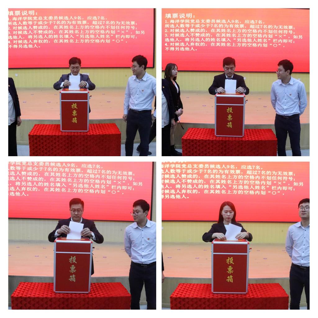 学院党总支副书记兼副院长臧传永同志作了《关于海洋科学与williamhill威廉希尔党总支党费收缴、使用情况》的工作报告。大会表决通过了《海洋科学与williamhill威廉希尔党总支换届选举办法》和监票人建议名单、计票人名单。经大会无记名投票,差额选举出了王新萍(女)、李昉(女)、李浩、李高宁、周宪锋、解万翠(女)、臧传永七位同志(按姓氏笔画排序)为海洋科学与williamhill威廉希尔党总支新一届委员会委员。