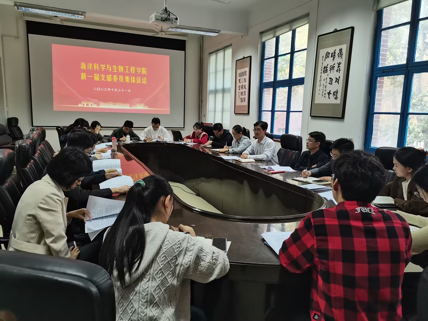 10月31日下午,海洋学院开展新一届支部委员集体谈话。学院党总支委员和新一届党支部委员参加谈话会,党总支书记周宪锋主持会议并讲话。