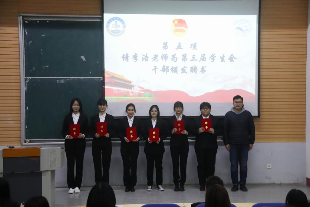 秦晓为海洋学院第二节优秀学生干事颁发荣誉证书。李浩为海洋学院第三届学生会部长副部颁发聘书。