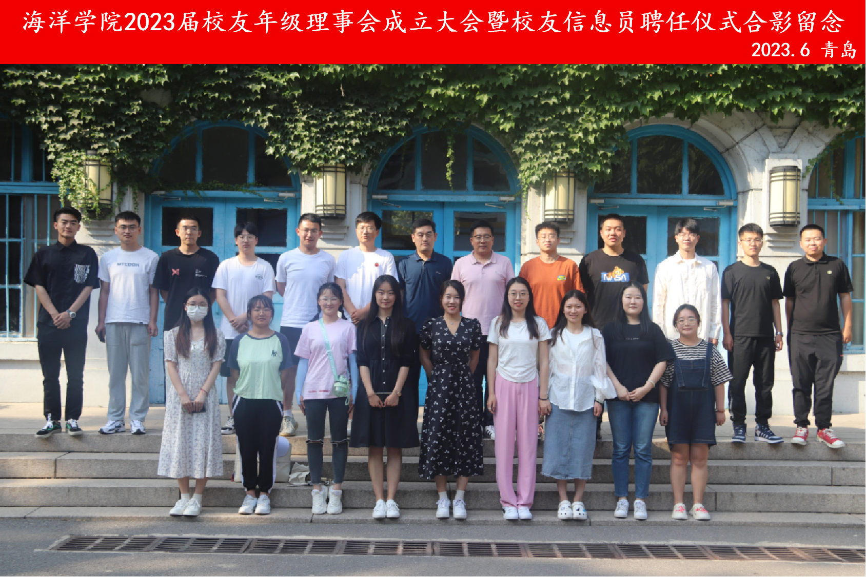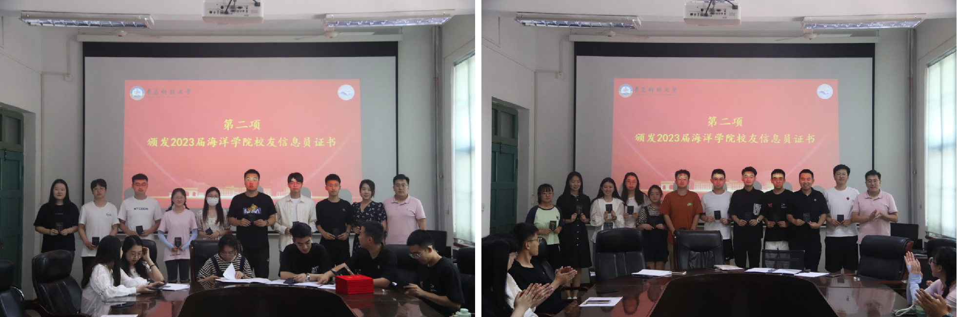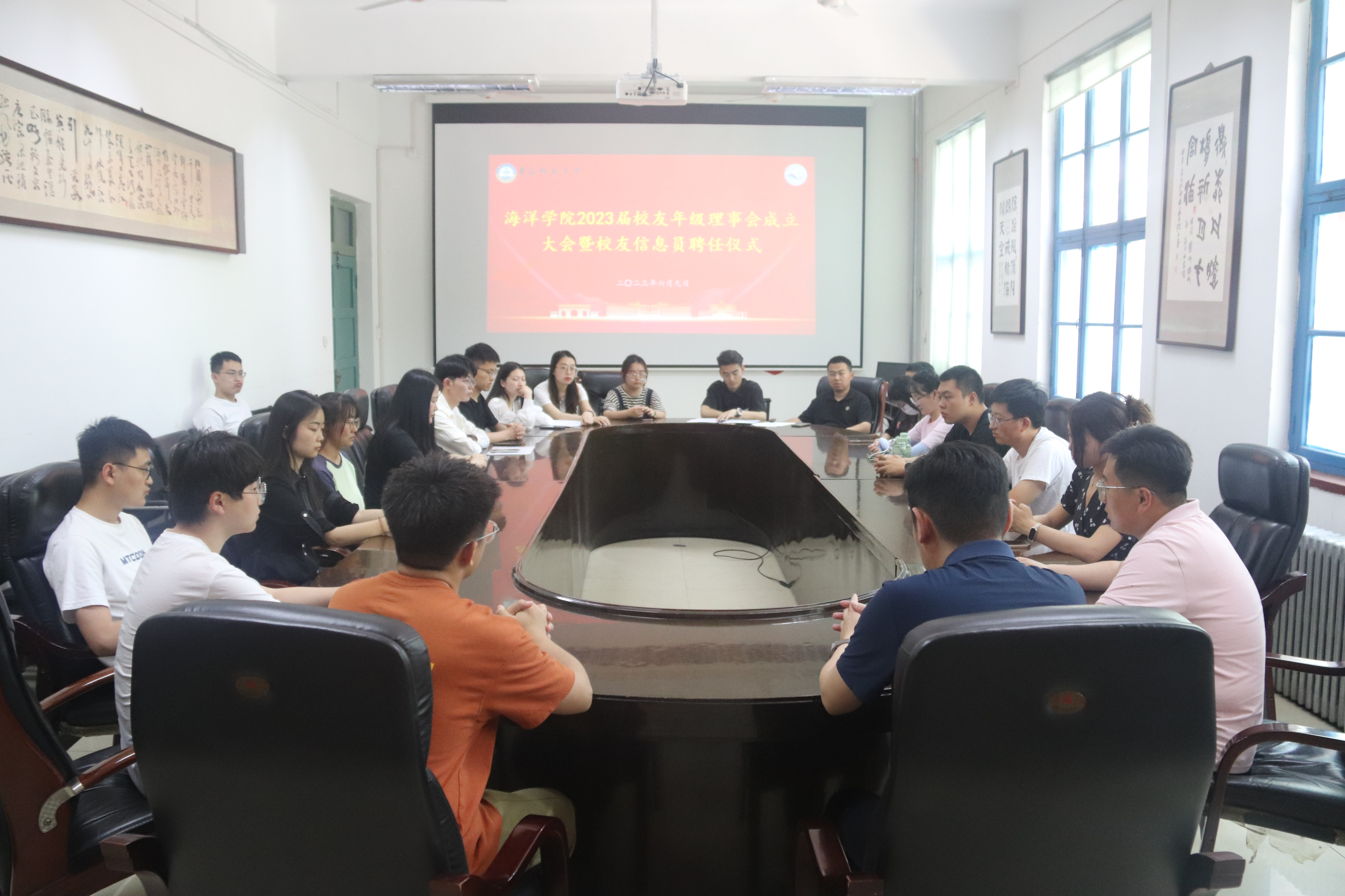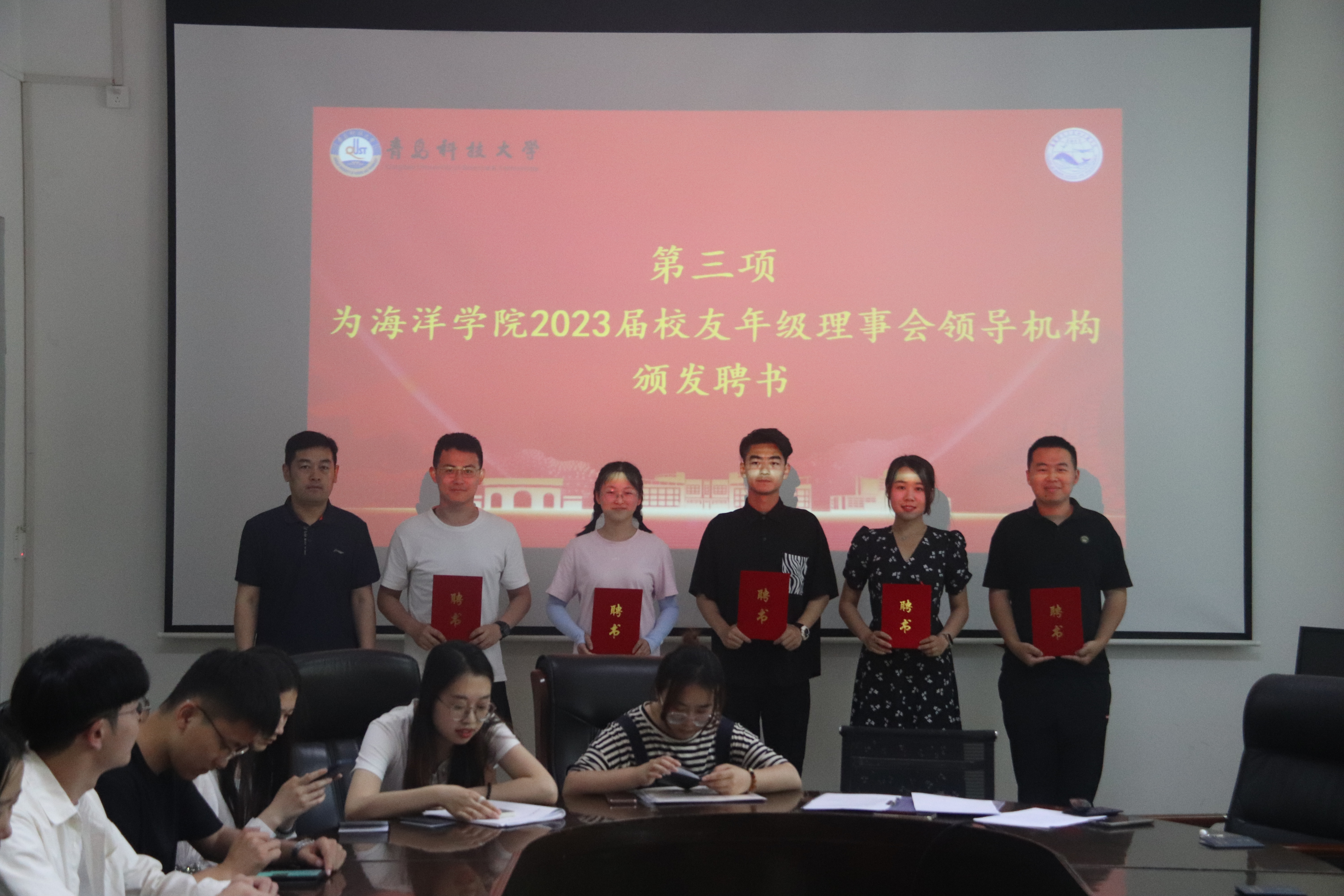 青春科大行,一生海洋情。6月9日,海洋学院2023届校友年级理事会成立大会暨校友信息员聘任仪式在海洋学院会议室举行。学院党总支副书记兼副院长、学院校友会副秘书长臧传永,学工办主任兼团委书记、2019级辅导员李浩出席会议。